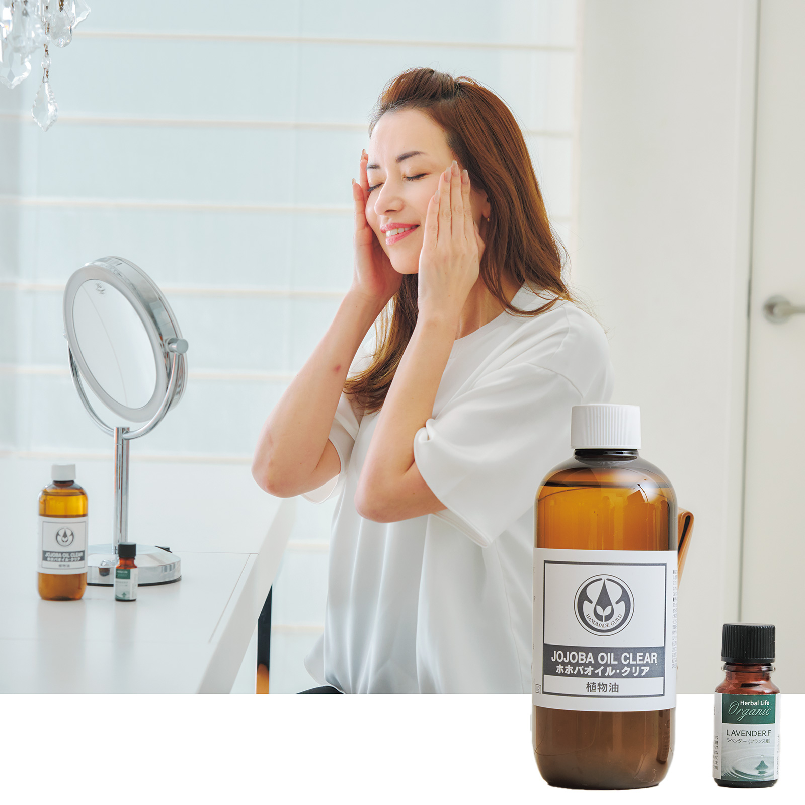 睡眠不足になると体調だけでなく肌の調子も落ちるのでお手入れは時短が基本。生活の木のホホバオイルクリア250mlにラベンダーオイルを数滴混ぜたものをボトルに入れてケアしています。朝晩、500円玉大を手に取り、顔を中心に全身にハンドプレス。肌だけでなく心地良い香りで心も癒されます。