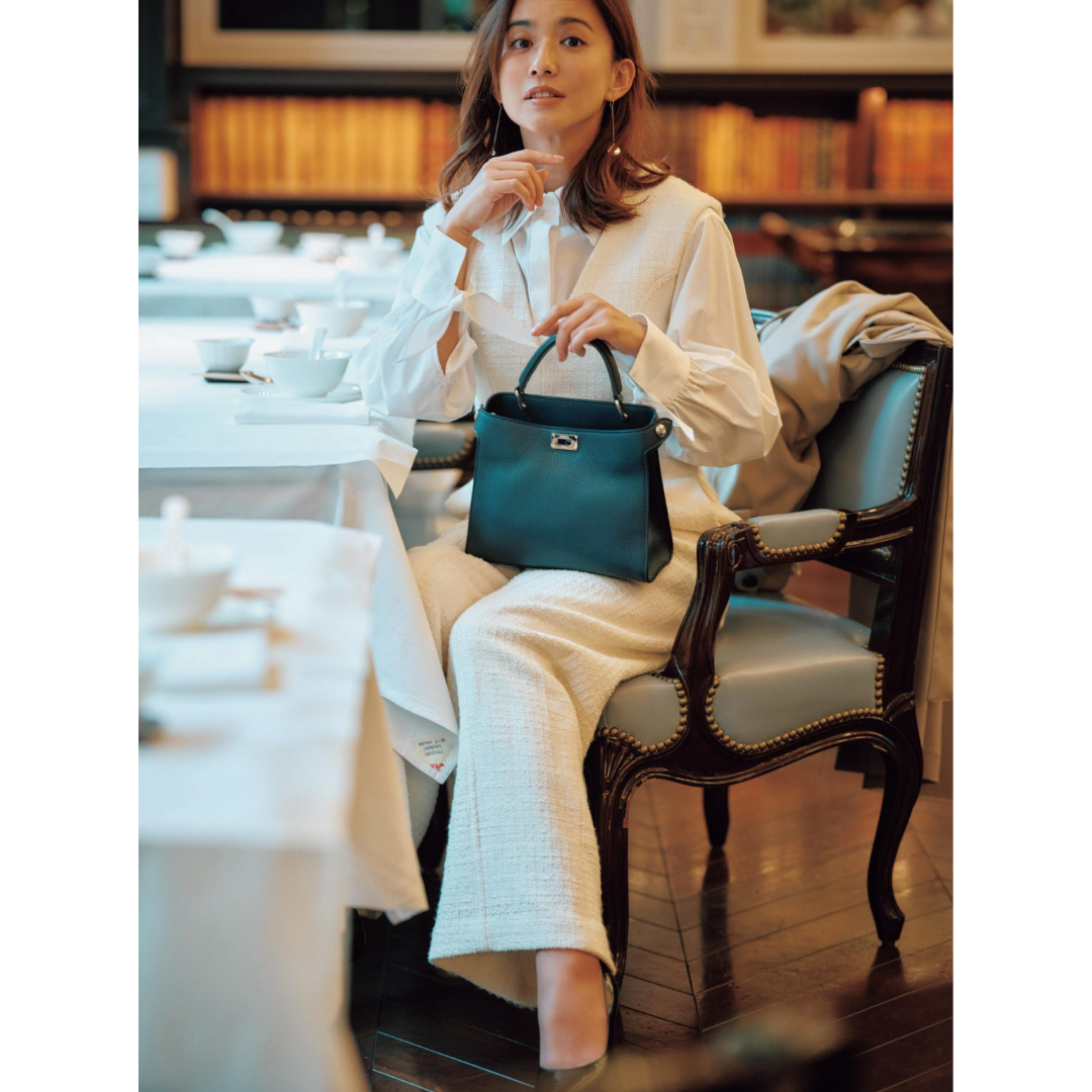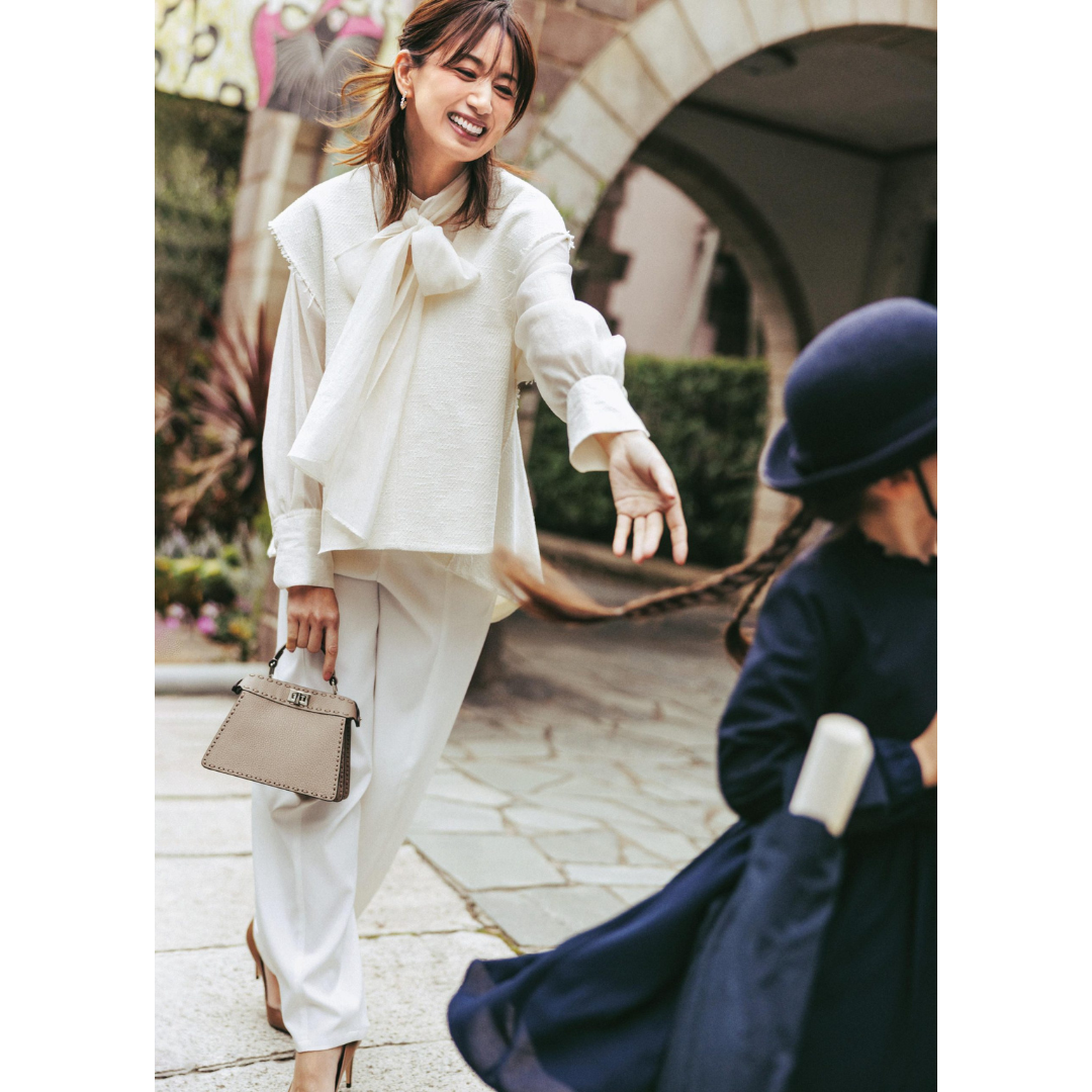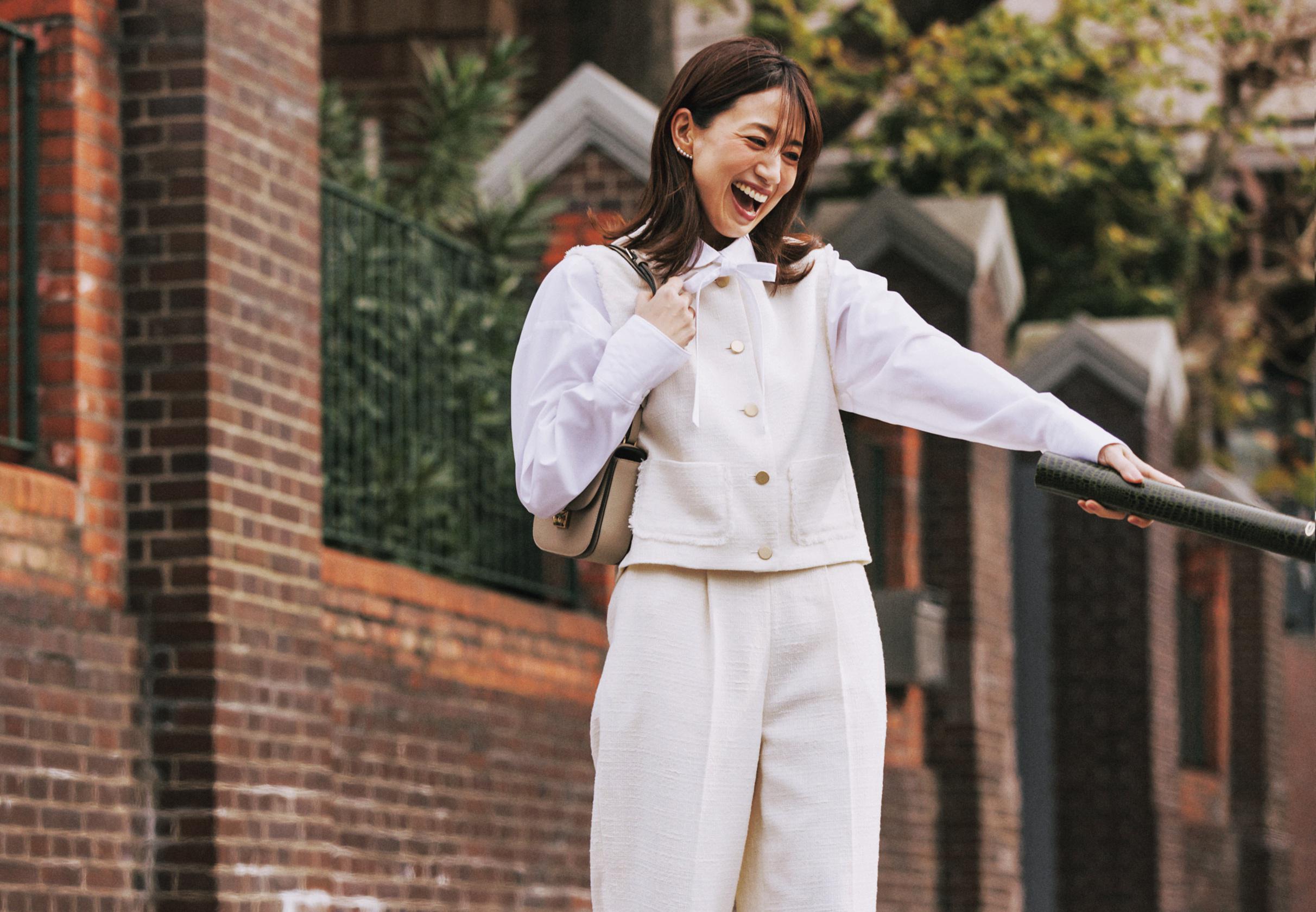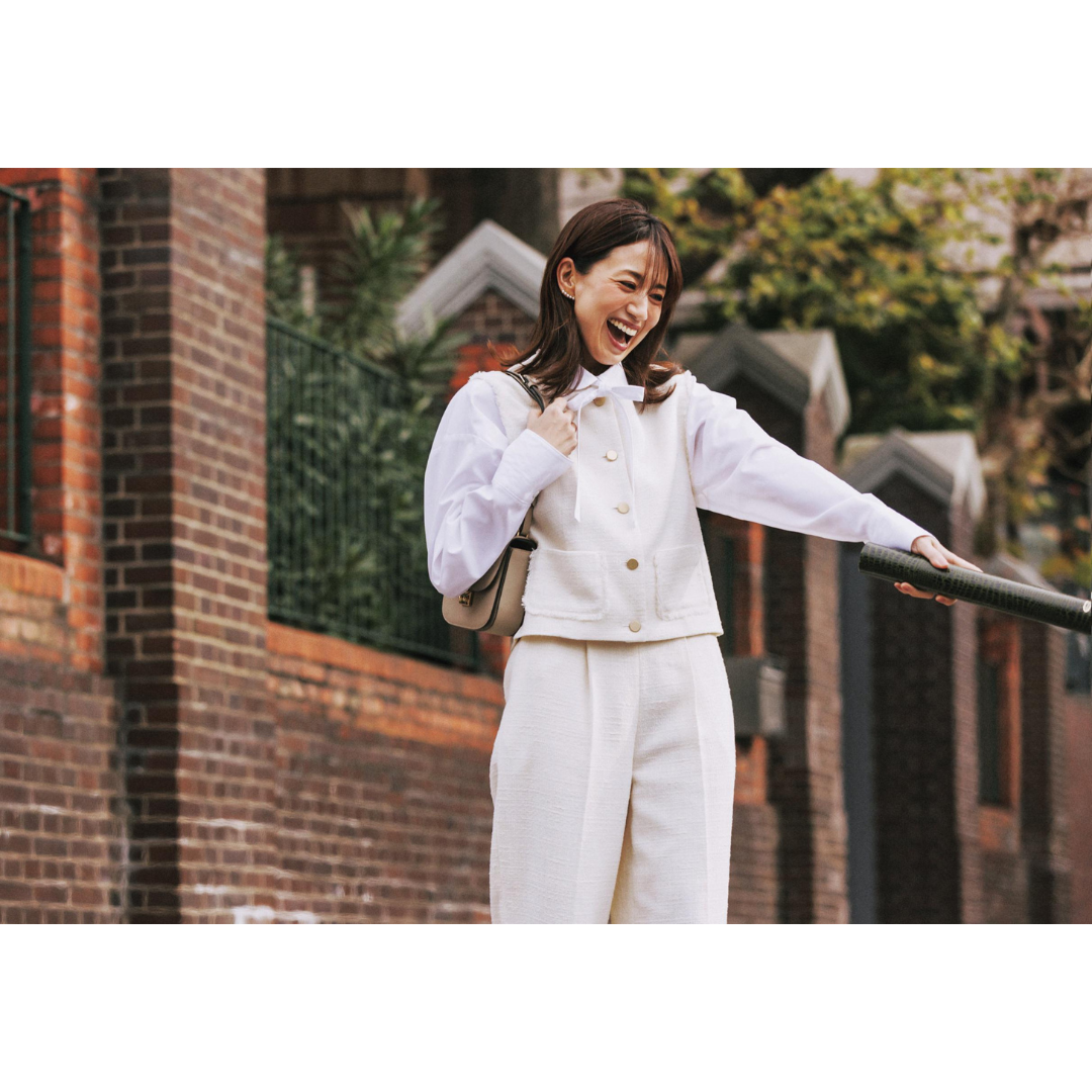 全身白・ボウタイ・ツイードといったコンサバ要素と、ベストの少しリラックスした雰囲気が耕バランス。ベストはスタンブリー、ブラウスはアルページュストーリー、パンツはエンフォルド、バッグはフェンディ、パンプスはセルジオ ロッシ。
