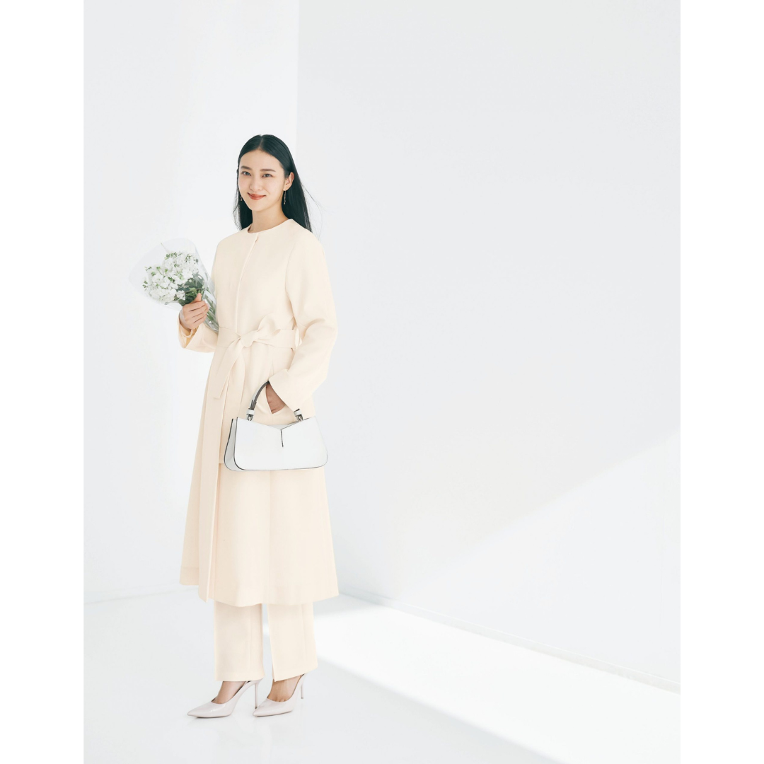 ジャケットではなくロングコートをワンピースのように着たスタイル。コートの前を閉めて小物も白でまとめると、凛と潔くカッコいい雰囲気が出ます。コートとパンツとバッグはアナイのもの。