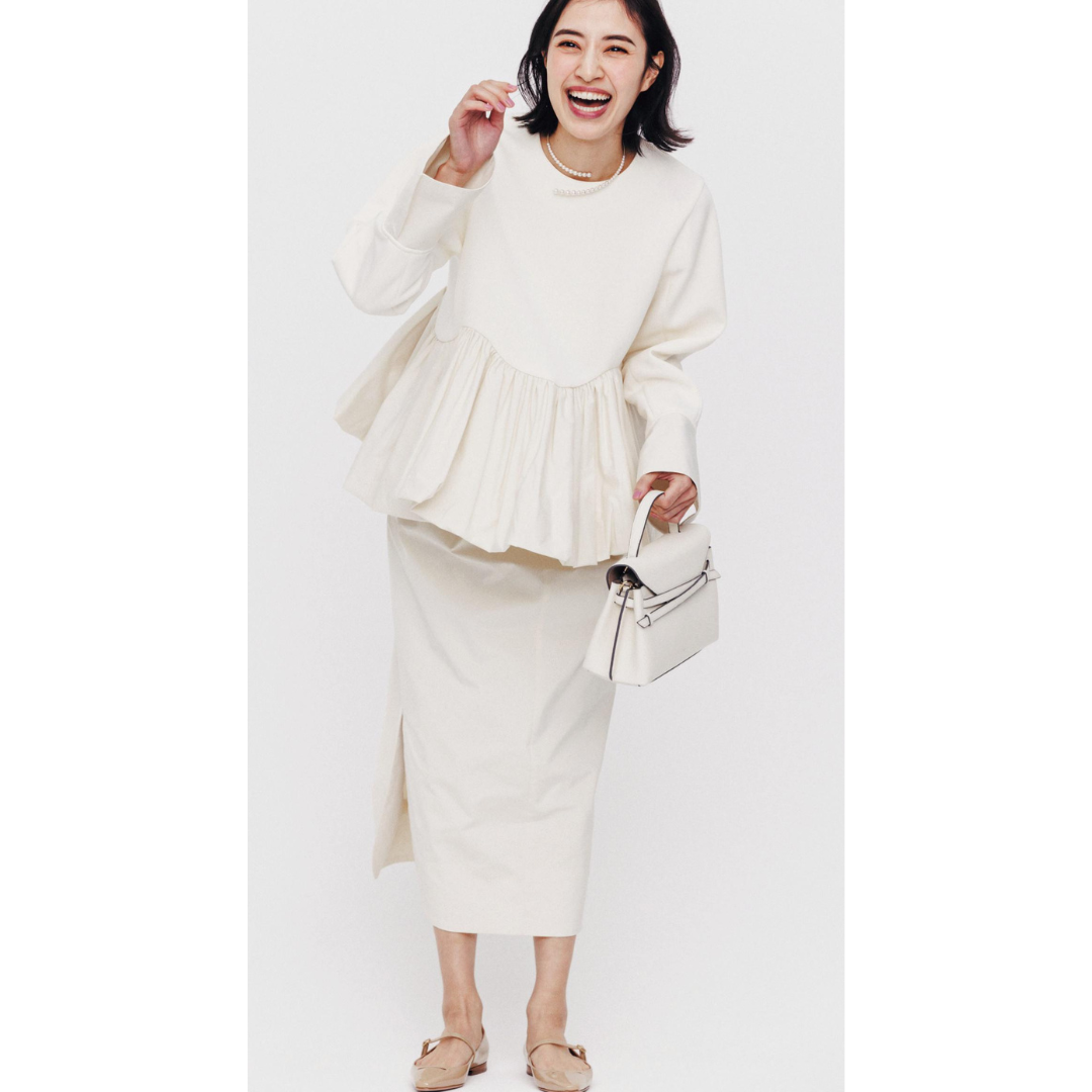 ジャケットを着るといかにもコンサバ感が出てしまうので、簡単にこなれた白コーデならトップス+ボトムスのセットアップにするのもあり。アダム エ ロペのセットアップなら、トップスの袖がカフスになっていたり、スカートが長めでスリットが入っていたりとモードに着こなせる要素が満載。バッグはトーヴ、パンプスはペリーコのもの。