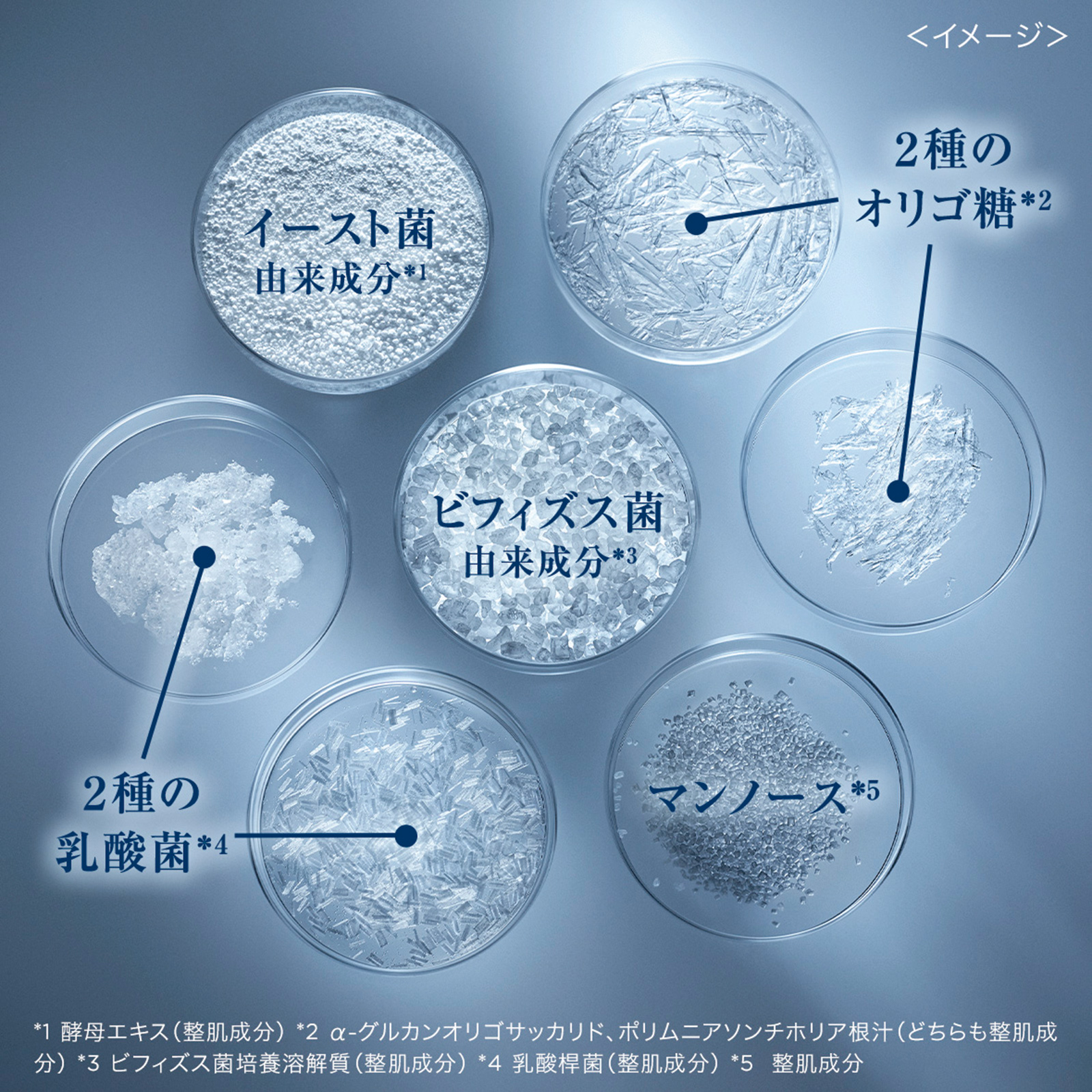 3種のプレバイオティクス(2種のオリゴ糖とマンノース)、4種のプロバイオティクスを配合。プレ/プロ両方配合は希少。※1酵母エキス(整肌成分)※2 α-グルカンオリゴサッカリド、ポリムニアソンチホリア根汁(どちらも整肌成分)※3ビフィズス菌培養溶解質(整肌成分)※4乳酸桿菌(整肌成分)※5整肌成分