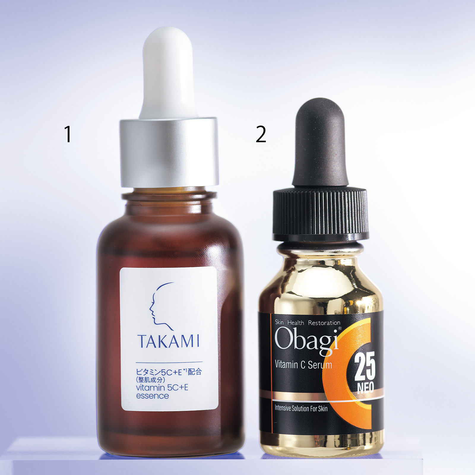 1:即効性のあるピュアビタミンCのほか、アプローチの異なる5種のビタミンCを配合。タカミエッセンス5C+E 30ml¥5,500(タカミ)2:ベース成分の開発によりピュアビタミンCの高濃度、高浸透、超安定化に成功。進化を重ねて浸透スピードがより加速。オバジC25セラム NEO 12 ml¥11,000(ロート製薬)