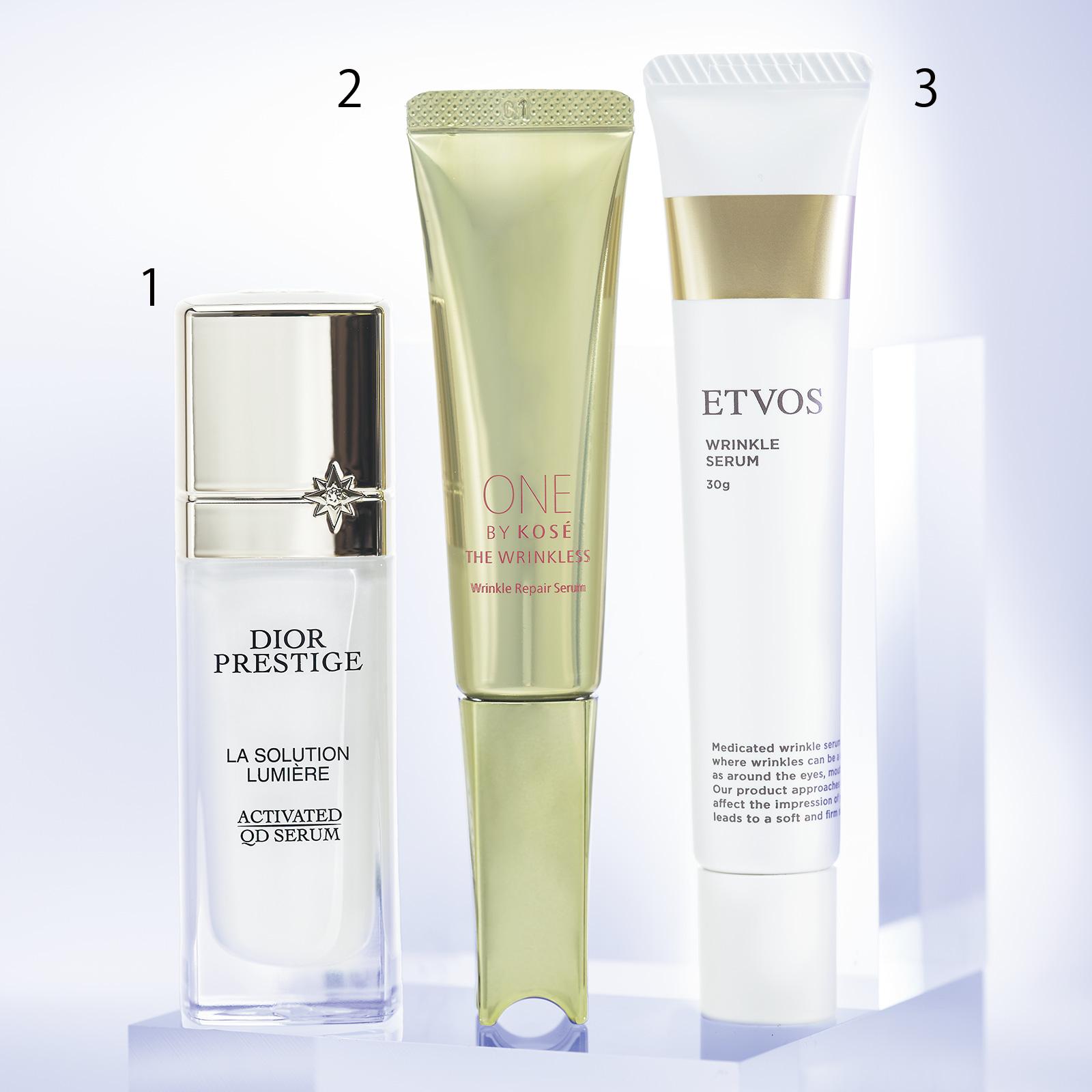 1:独自のナイアシンアミドCDで弾力アップと美白効果。プレステージ ホワイト リンクル セラム ルミエール[医薬部外品]30ml¥58,300※2/23発売(パルファン・クリスチャン・ディオール)2:シワ改善と美白効果。真皮、表皮の2層に作用。ONE BY KOSÉザリンクレス S[医薬部外品]20g ¥6,380〈編集部調べ〉(コーセー)3:ナイアシンアミドがコラーゲン産出を促し水分保持力と皮膚の柔軟性を高めてシワを改善。薬用リンクルセラム[医薬部外品]30g ¥6,380(エトヴォス)