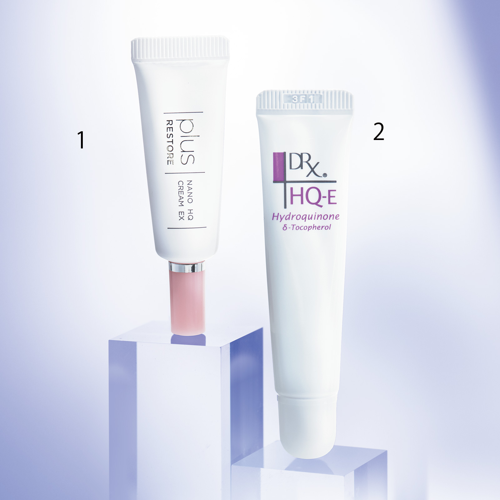 1:ハイドロキノンを4%と高濃度に配合。くすみが気になる部分へのスポットケアを。プラスリストア ナノHQクリーム EX〈クリニック専売品〉5g ¥2,200(ジェイメック)2:ハイドロキノンを安定化して配合。各層の深部にまで浸透する処方で透明肌に。 DRX® HQダブルブライトE〈クリニック専売品〉6g ¥ 2,200(ロート製薬)