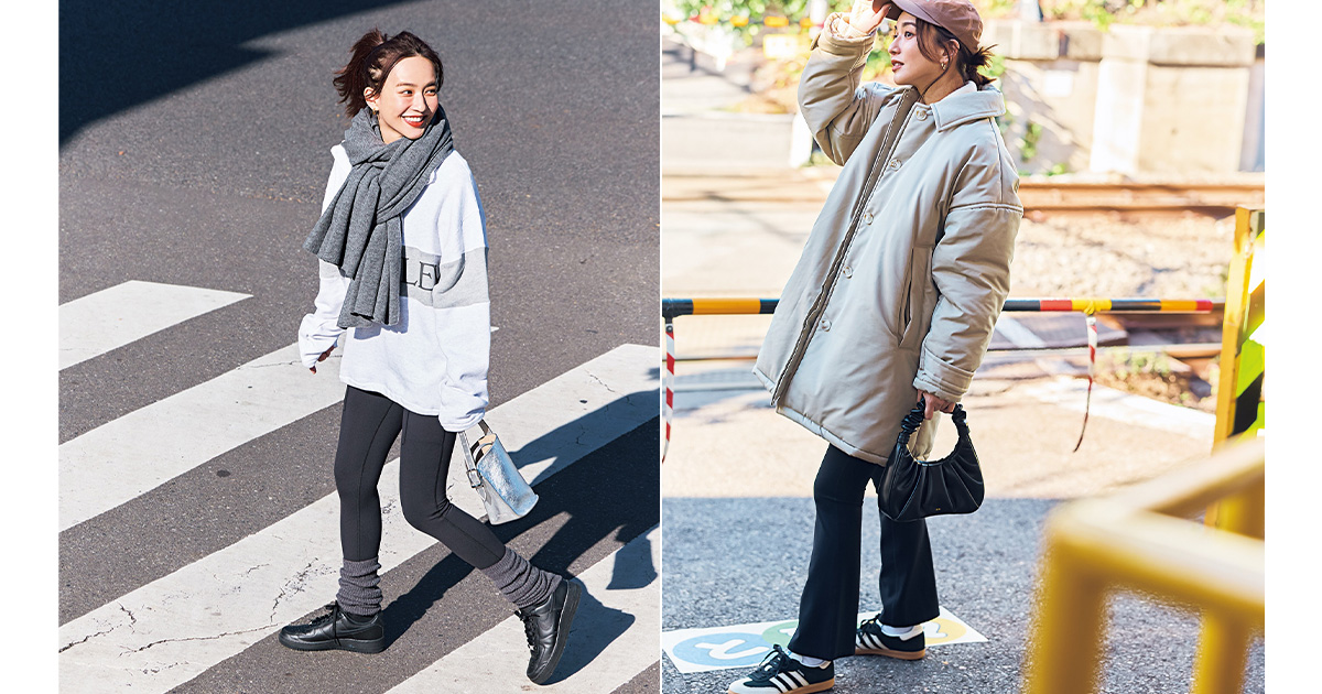 レギンス¥7,800(アンダール)コート¥36,300(カベサロッソ)ニット¥19,000(コス/コス青山店)キャップ¥6,930(エミ/エミニュウマン新宿店)ピアス¥15,400(ローラロンバルディ/八木通商)バッグ¥16,500(JW PEI/ル フィル ニュウマン 新宿店)スニーカー¥15,400(アディダス オリジナルス/アディダスお客様窓口)ソックス¥880(靴下屋/タビオ)