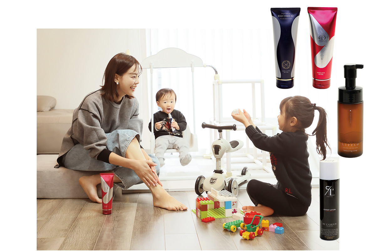 幼稚園に通う4歳と離れるとぐずる 1歳の子育て中で、自分時間はヘアサロンに行くのがやっと。定期的なエステ通いが難しいので子どもと遊びながらボディラインをメンテナンス。AXISのボディメイク 4Dでマッサージ。お風呂でフェムケア用バランシングソープLIFELO でお手入れし、幹細胞由来成分が入ったリアボーテの炭酸エキスパートローションで毎日マッサージしながら頭皮ケアも。