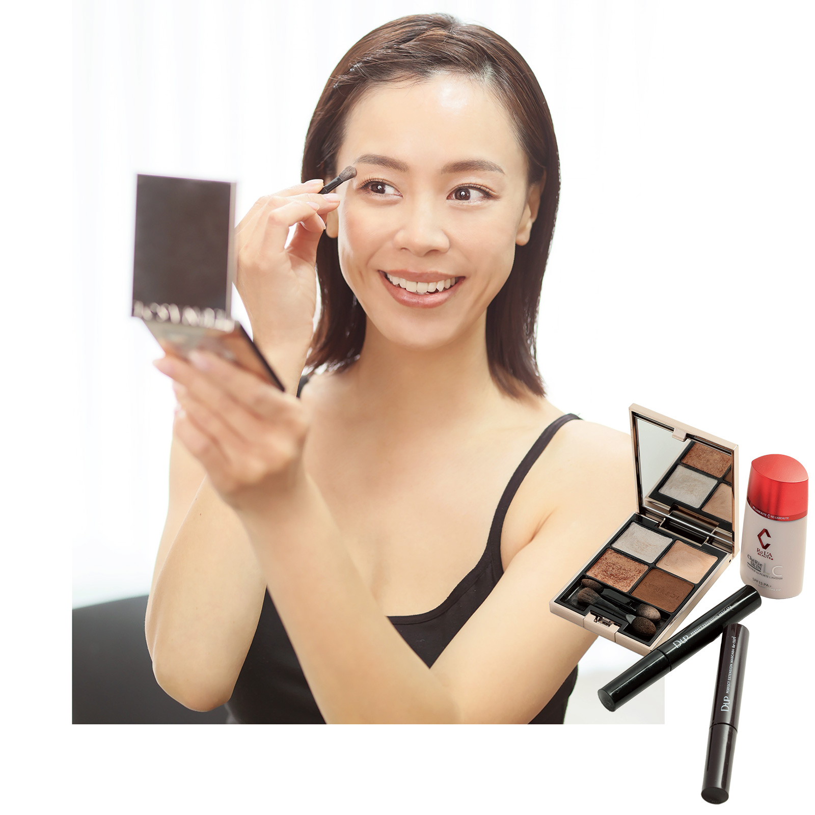 シャドウはルナソルのアイカラーレーション 15を愛用中。右下の締め色以外は筆でふんわりまぶたにのせます。締め色はチップで締めて立体に。ファンデは使わずリアボーテのシェリースキンクリスタルライティングCCを、マスカラは D-upのブラックとブラウンを洋服によって使い分け。