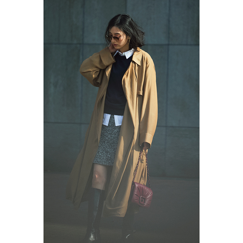 トレンチコート¥74,800(ハイク/ボウルズ)ニット¥47,300(ATON/エイトン青山)シャツ¥28,600(スリードッツ/スリードッツ表参道店)スカート¥17,600(アルページュストーリー)サングラス¥49,500(アイヴァン/アイヴァン 東京ギャラリー)ピアス¥41,800(ブランイリス/ブランイリス トーキョー)バッグ¥567,600(ロジェ ヴィヴィエ/ロジェ・ヴィヴィエ・ジャパン)ブーツ¥41,800(ダイアナ/ダイアナ 銀座本店)