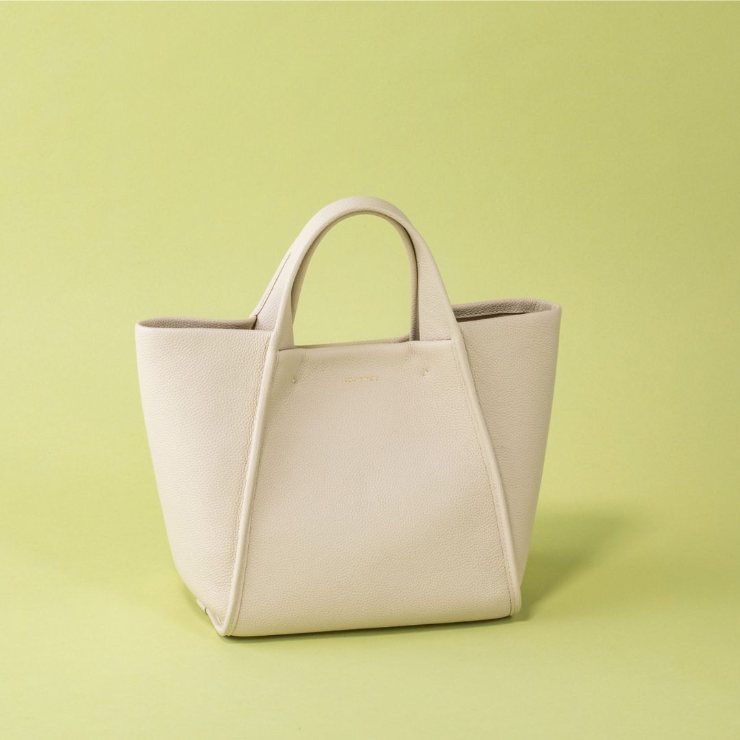 流行のクワイエットラグジュアリーをキャッチアップできるミニマルなハンドバッグ。装飾をそぎ落としているからこそ、計算されたシルエットと本革を使用した丁寧な縫製が際立ちます。しっかりと厚みのあるレザーと柔らかなフォルムが、エレガントな雰囲気。デイリー使いできるリアルなプライスも重要ポイントです。バッグ[W38×H24.5×D16.5cm]¥41,800(フィールアンドテイスト)