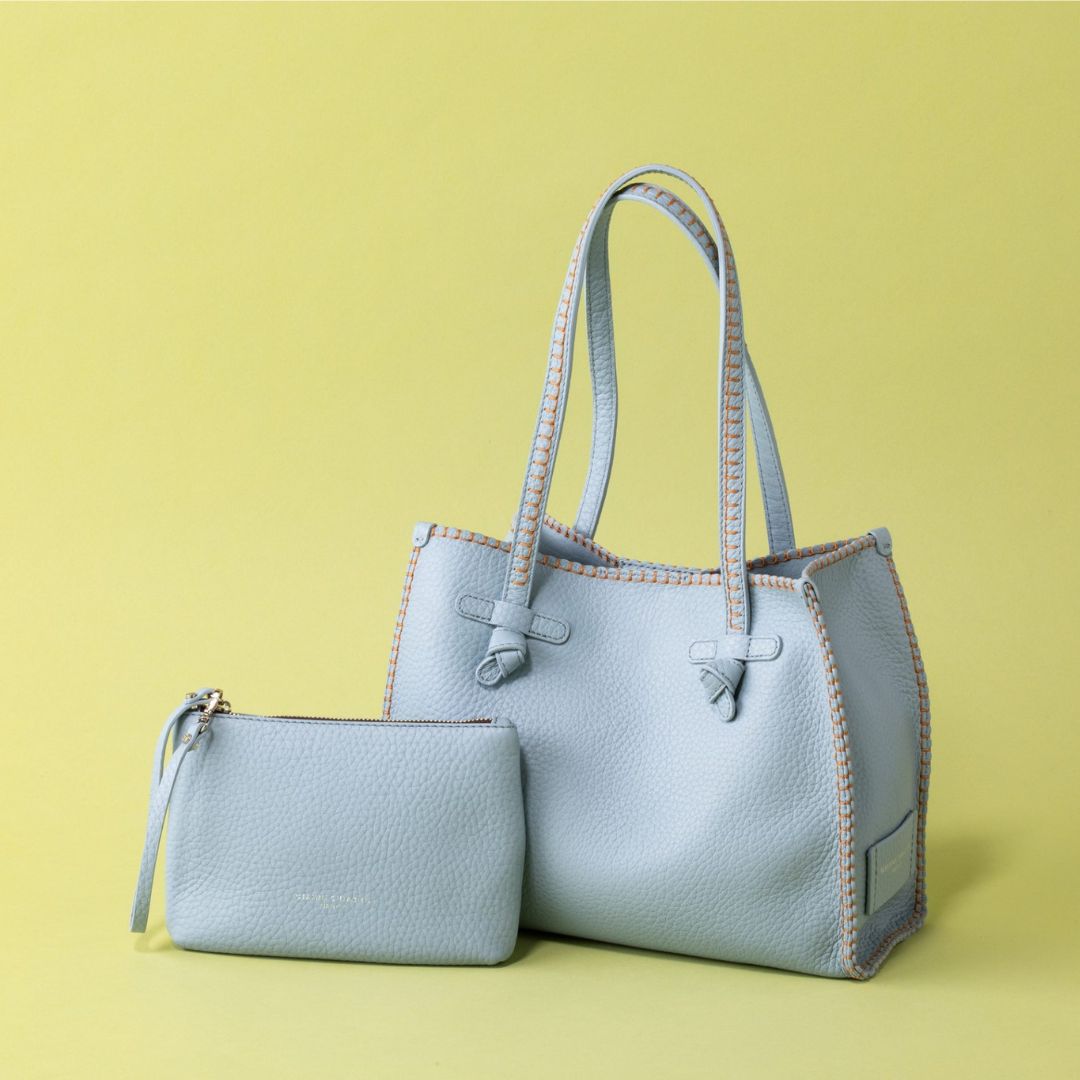 元気が出る爽やかな水色のバッグは、自由な社風の通勤バッグにぴったり。ハンドルが長く、重いPCが入っていても肩に掛けられる実用性も◎。コンパクトな小旅行にもいけちゃうレベルの収納力があり、幅広マチ・自立型・付属のポーチで整理整頓もしやすい。バッグ[W33×H25×D13cm]¥74,800(ジャンニキアリーニ)