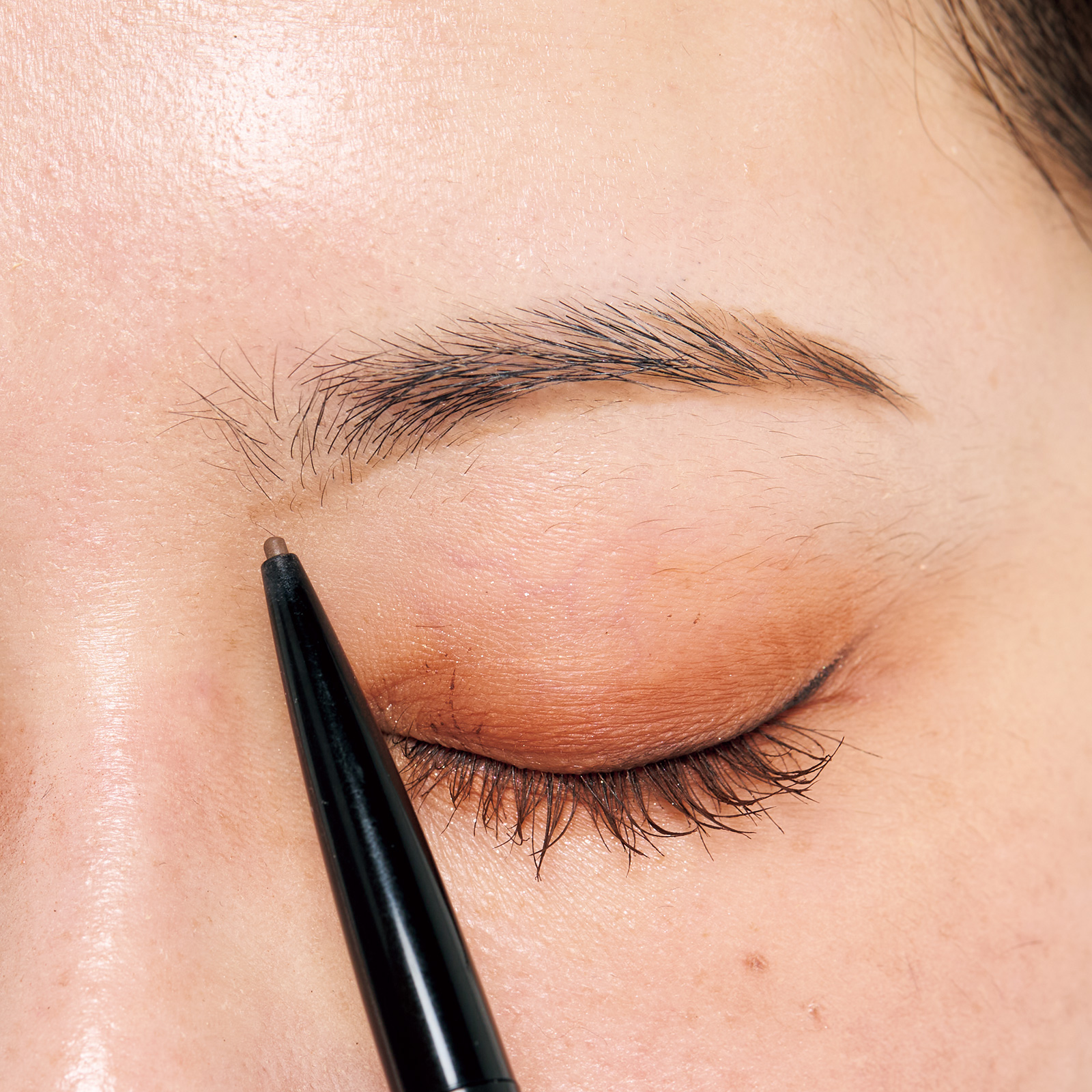ブラウンの極細ペンシルで、眉頭の始点を描く。眉間が離れている人は寄せ気味&角度を鼻筋方向へ落とし気味にして。