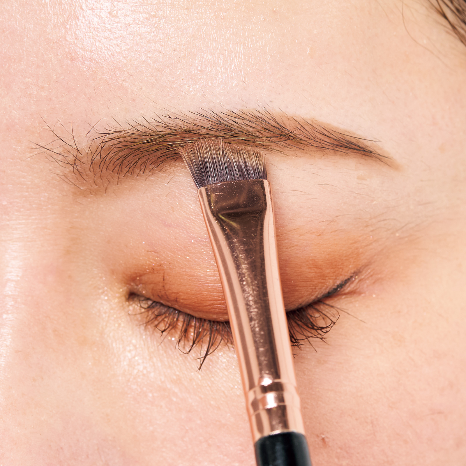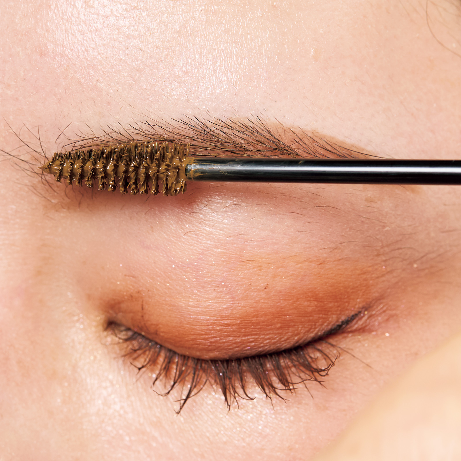 明るめキャメル色のアイブロウマスカラで毛流れを意識して全体を整える。ここで毛をキープ。