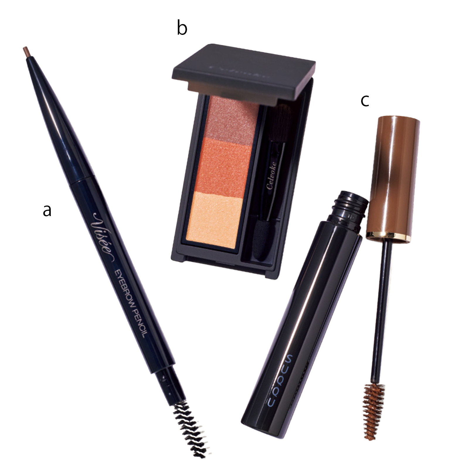 a.1.5mmの細芯なのに、柔らかい描き心地。ヴィセ リシェ アイブロウペンシルS BR 300 ¥594〈編集部調べ〉(コーセー)b. ふんわりパウダーなのにぴたりと密着。濃淡3色のブラウンがセット。上2色を混ぜて使用。セルヴォーク インディケイト アイブロウパウダー 06 ¥3,850(セルヴォーク)c.毛流れを整えながら、ツヤとボリュームを与え自然な立体眉に。肌に馴染むキャメル。SUQQU ボリューム アイブロウ マスカラ 03 ¥3,300(SUQQU)