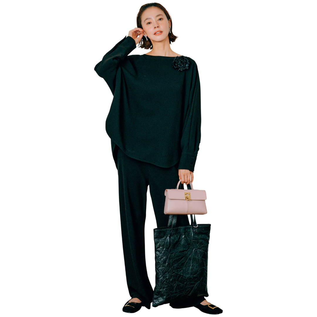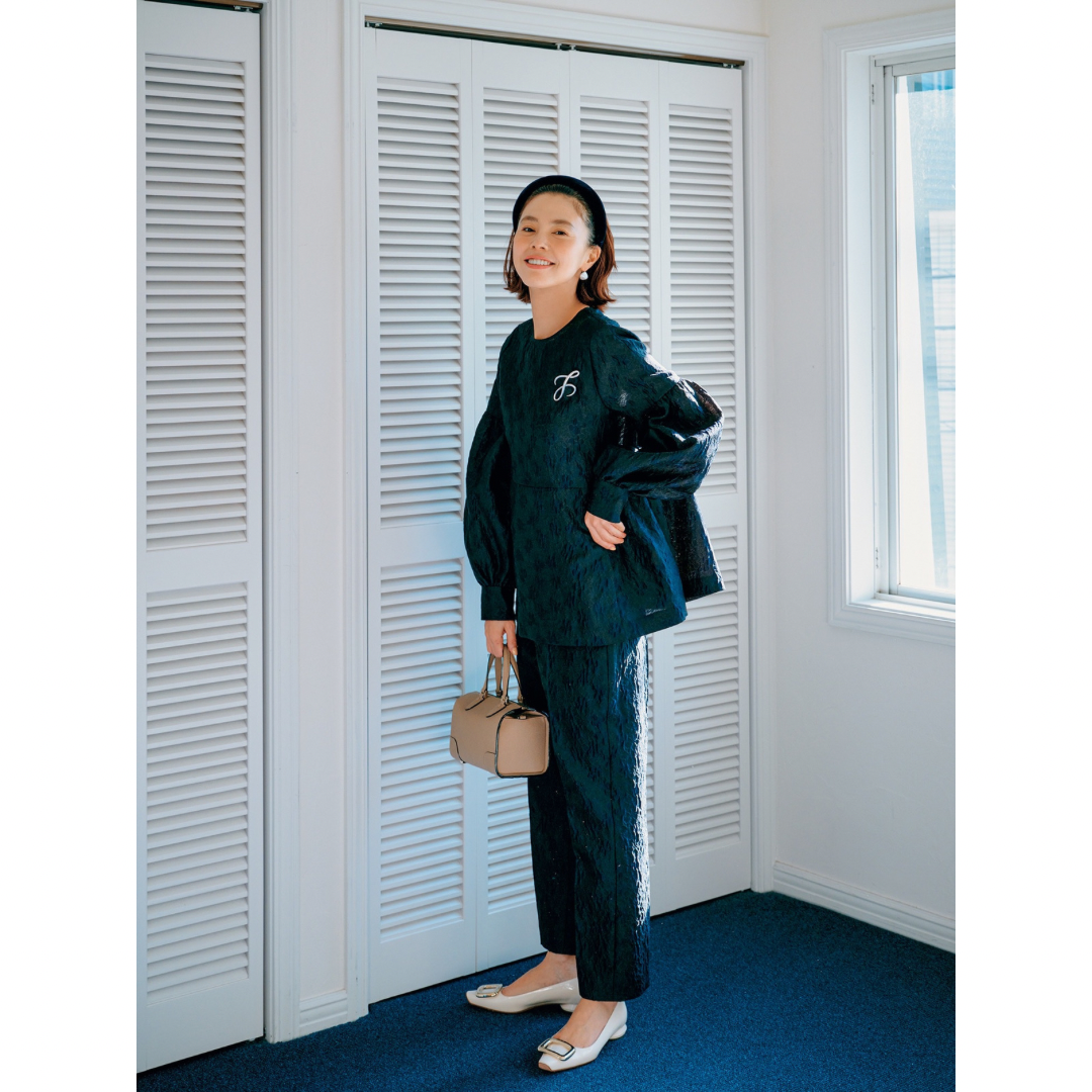 カチューシャはアレクサンドル ドゥ パリ、トップスとパンツはユナイテッドアローズ、バッグはヴァレクストラ、パンプスはロジェ ヴィヴィエのもの。