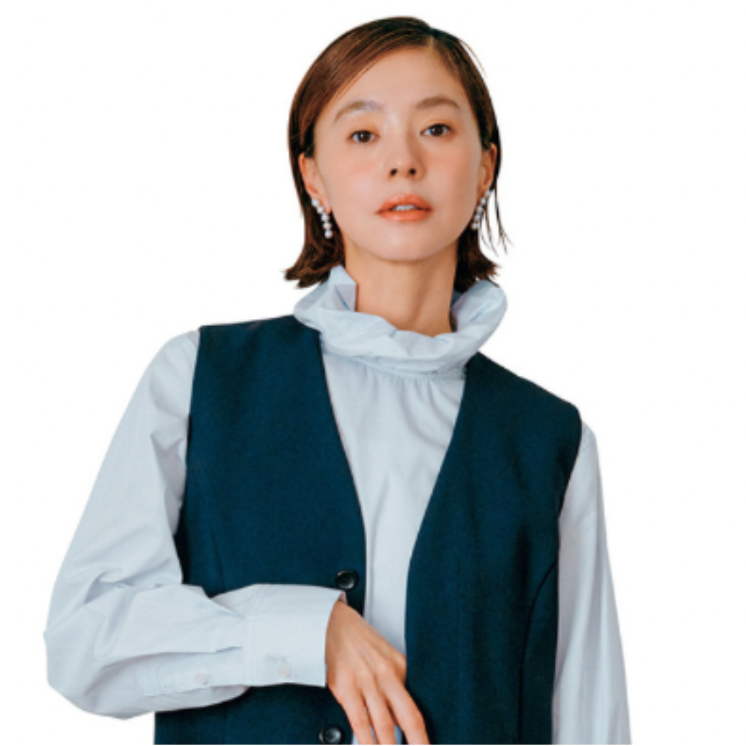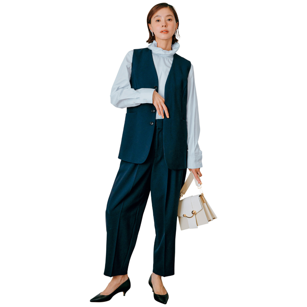 前髪を七三分けにすると、甘ブラウスのコーディネートもモードにキマります。ジレとパンツはミースロエ、ブラウスはクラネ、バッグはストラスベリー、パンプスはネブローニ。