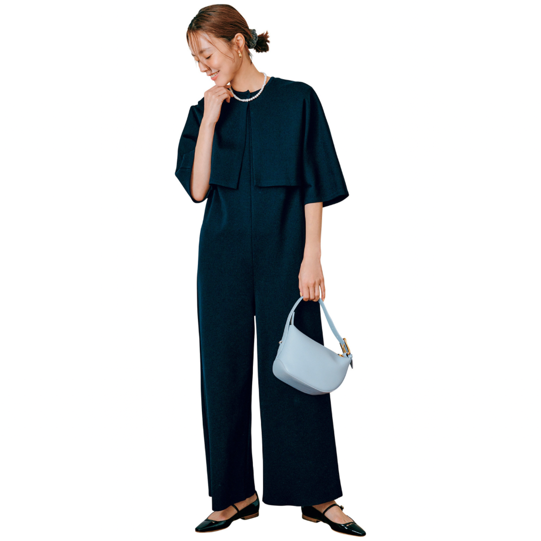 シュシュ(2個セット)はトレス、オールインワンとジャケットはボールジィ、バッグはJ &Mデヴィッドソン、パンプスはペリーコのもの。