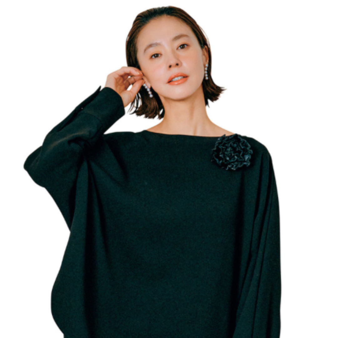 前髪をオールバックにしてクールに。トップスとパンツはプルミエ アロンディスモン、ピアスはリプサリス、コサージュはアルディー ノアール。