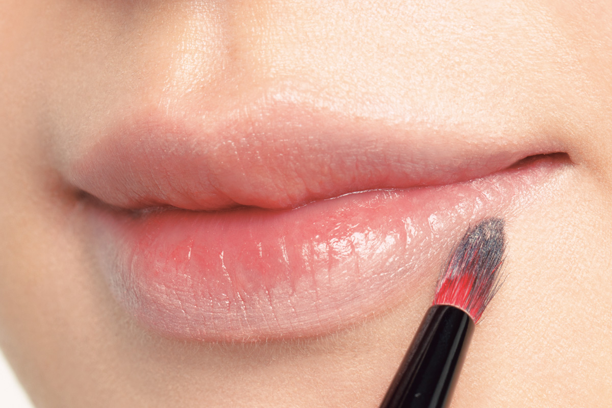 顔全体に塗って余った残りのファンデを細めの筆に取り、唇の輪郭全体にサッと軽くのせる。ベージュ系のリキッドコンシーラーでもOK。