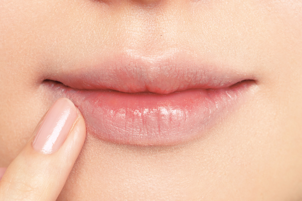 指先で輪郭と唇の内側にも少しボカして馴染ませる。口まわりがくすんだまま、くすみ色を塗るとキレイに仕上がらないため、輪郭の境目を一度消して。