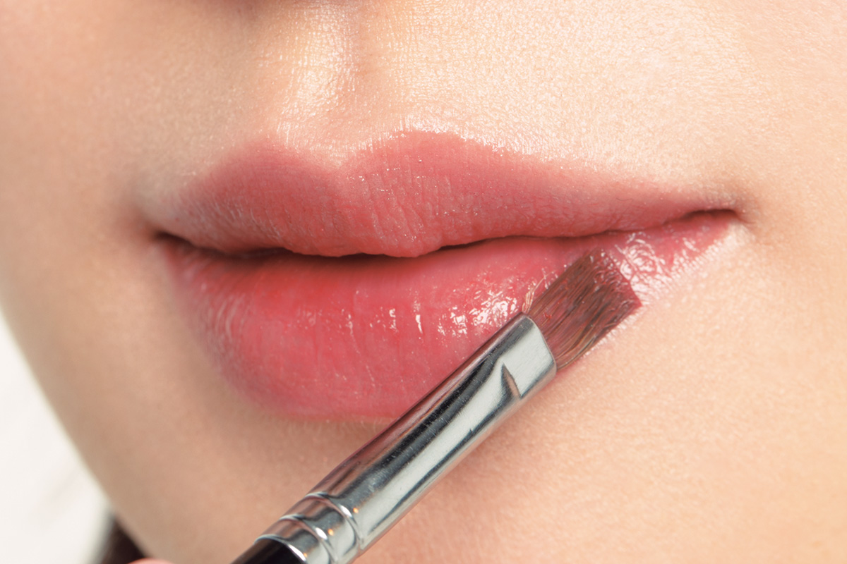 ブラウンは筆塗りでオン。平筆ではっきりめに輪郭を描いても、透けブラウンだから濃くならずに肌にしっくり馴染み、唇が浮くことなく立体感を出せます。
