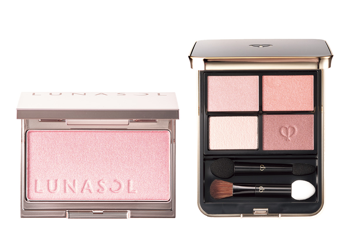 アイシャドウの左上をアイホール、右上を二重幅と下目尻1/4に。右下を下まぶた全体に。チークは頰骨に沿って、黒目下から斜め楕円に。左:ルナソルカラーリングシアーチークス(グロウ) 05 ¥3,850 〈セット価格〉(カネボウ化粧品)右:クレ・ド・ポーボーテオンブルクルールクアドリ8 ¥9,680 〈セット価格〉(クレ・ド・ポーボーテ)