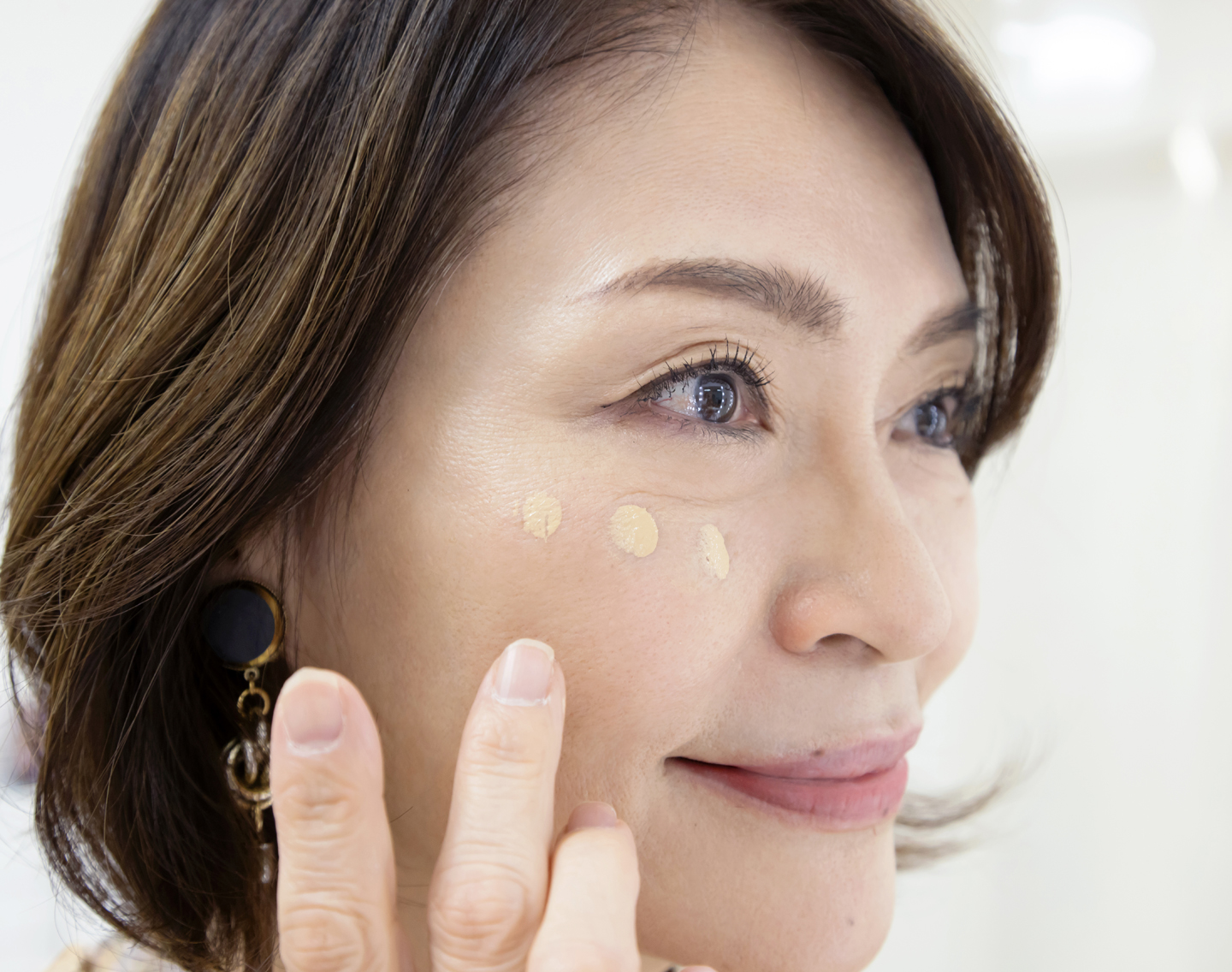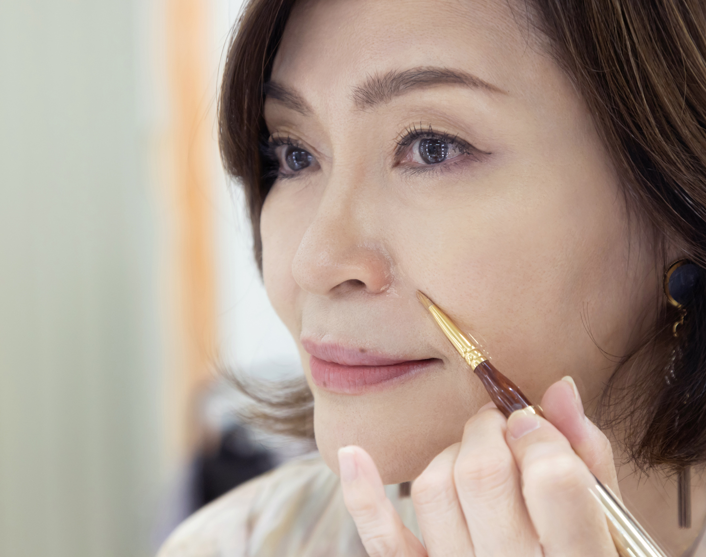 たるみ対策メイクのポイントは影やくぼみを徹底的に消すこと。不要な影を消すことで、ゆで卵のようなつるんとした肌に見せてくれます。難しいテクニックは必要なく、筆を使ってほうれい線や目元のシワにコンシーラーを薄く乗せるだけ。肌がトーンアップし、実際は年齢相応にたるんでいる肌が引き上がって見えるように。
