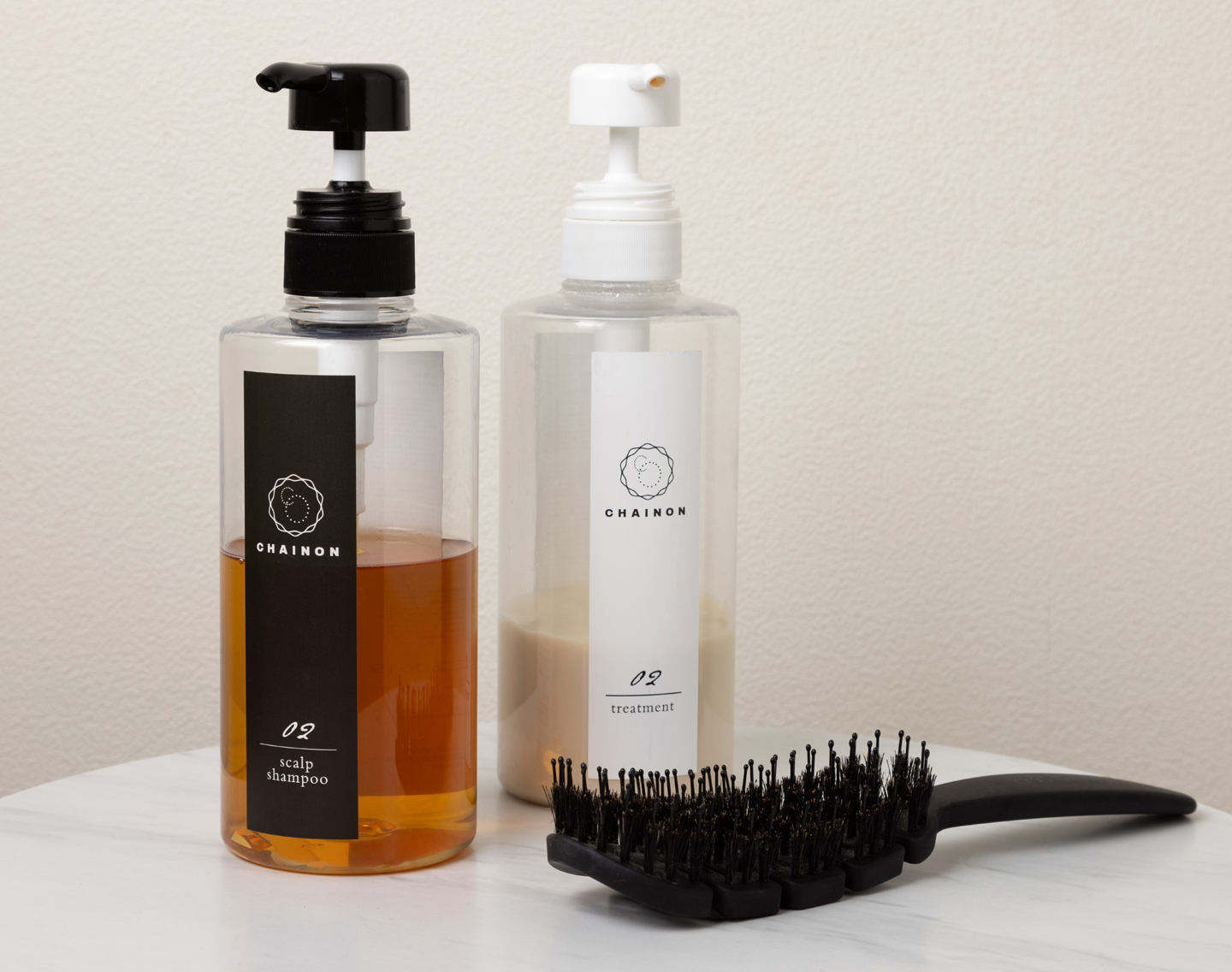 〈写真1枚目〉ヘアサロンCHAINONオリジナルのスカルプケアシャンプーと超修復セラミドトリートメントは15年ずっと愛用。自宅で髪質改善ができます。右はSei Hamada NY 3in1ブラシ。豚毛で髪にツヤを出し、静電気を起こして根元をボリュームアップ。すべて本多さん私物。