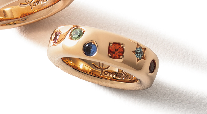 リング「イコニカ」[18KRG×オレンジサファイア×ピンクトルマリン×ペリドット×ルビー×ブルージルコン×ブルーサファイア×デマントイド×レッドスピネル×タンザナイト×ツァヴォライト]¥572,000(ポメラート/ポメラート クライアントサービス)