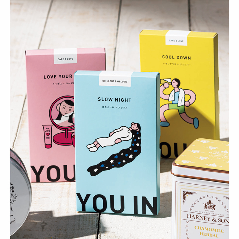 自分に優しく過ごしたい時をテーマに3つのムードに合わせたブレンドティーがセットに。オリジナルメッセージも付けられます。