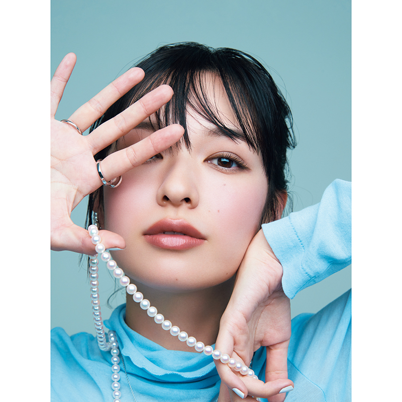 トップス¥8,800(マカフィー/トゥモローランド) イヤリング¥2,057,000 リング[人差し指]¥787,600 リング[薬指]¥462,000 パールネックレス¥1,254,000 ダイヤモンドパヴェネックレス¥1,053,800(すべてTASAKI)