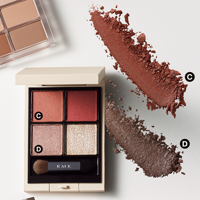 じんわり色づき洒落た目元に。【D】の影色を二重幅に仕込み、【C】のブラウンを広めに入れて血色感を。
