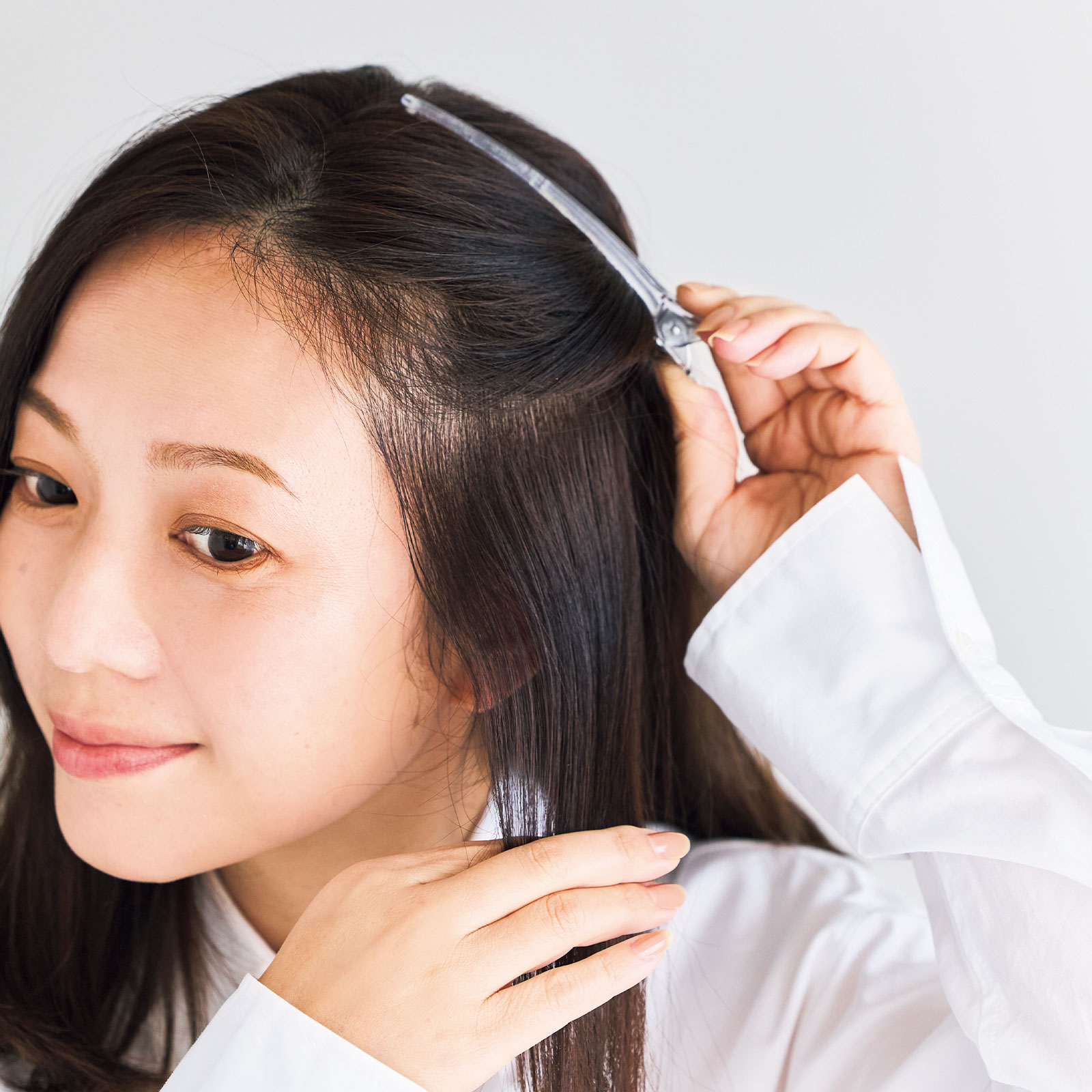 髪をハチ上とハチ下に分けてからスタート。クセやうねりをしっかりのばすために、上下に分けて丁寧にアイロンをあてることが大切です。
