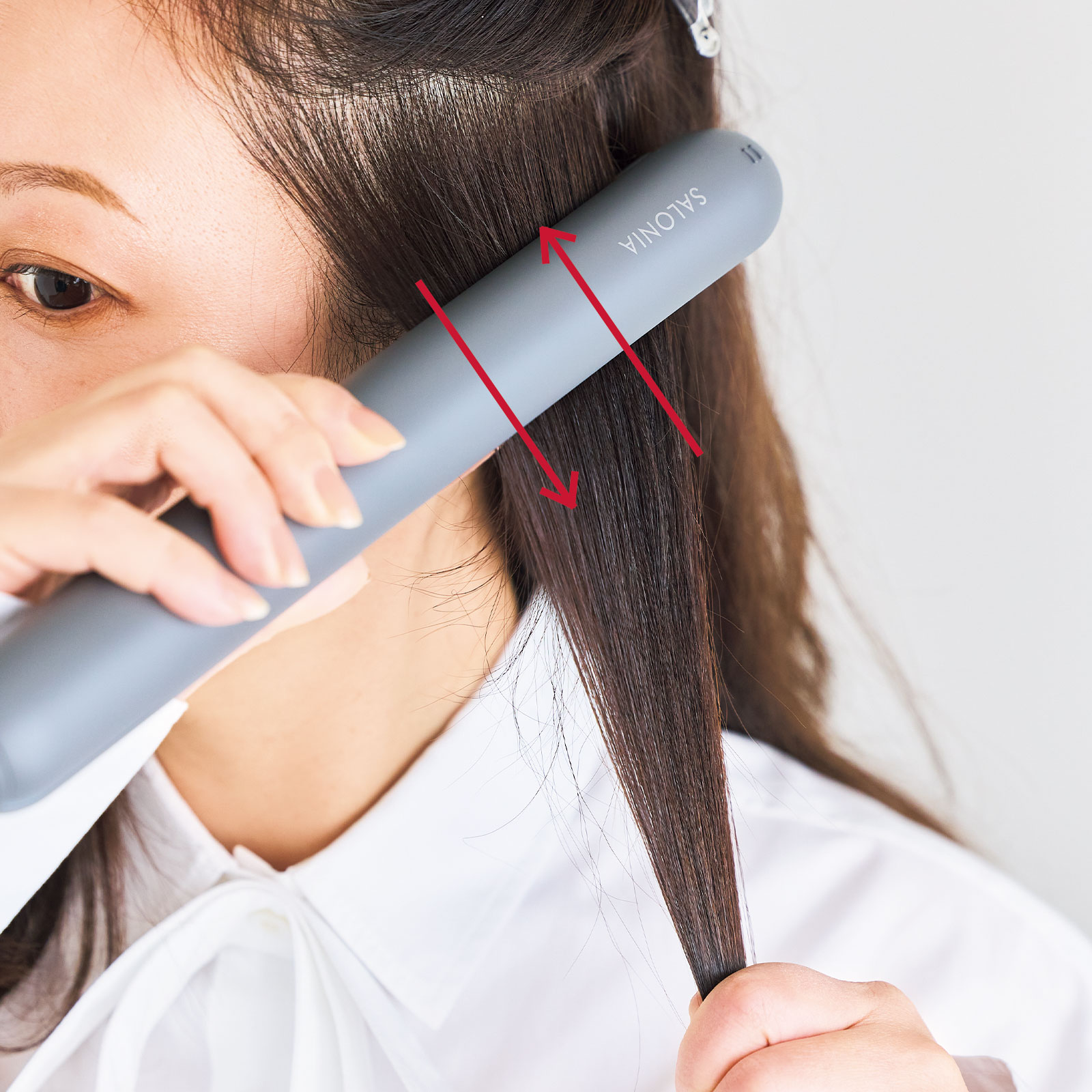 根元2~3cmを髪と平行にストレートアイロンで挟み、根元まで上下に行ったり来たりを3~4回繰り返しクセをのばします。