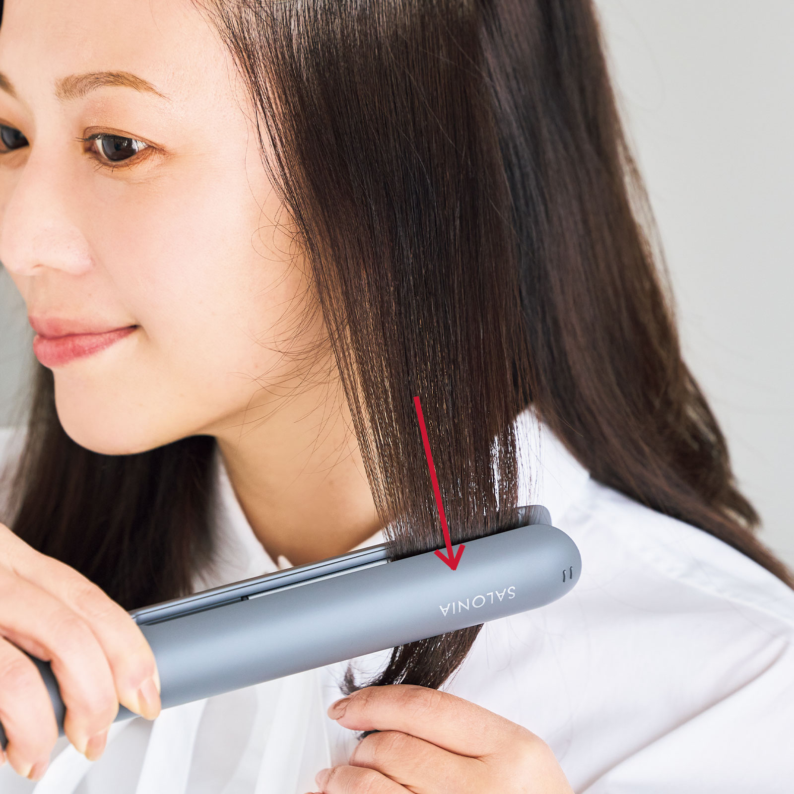 毛先は後でワンカールさせるため、その手前までゆっくりとアイロンを下ろしていき、髪のクセをのばしていきます。