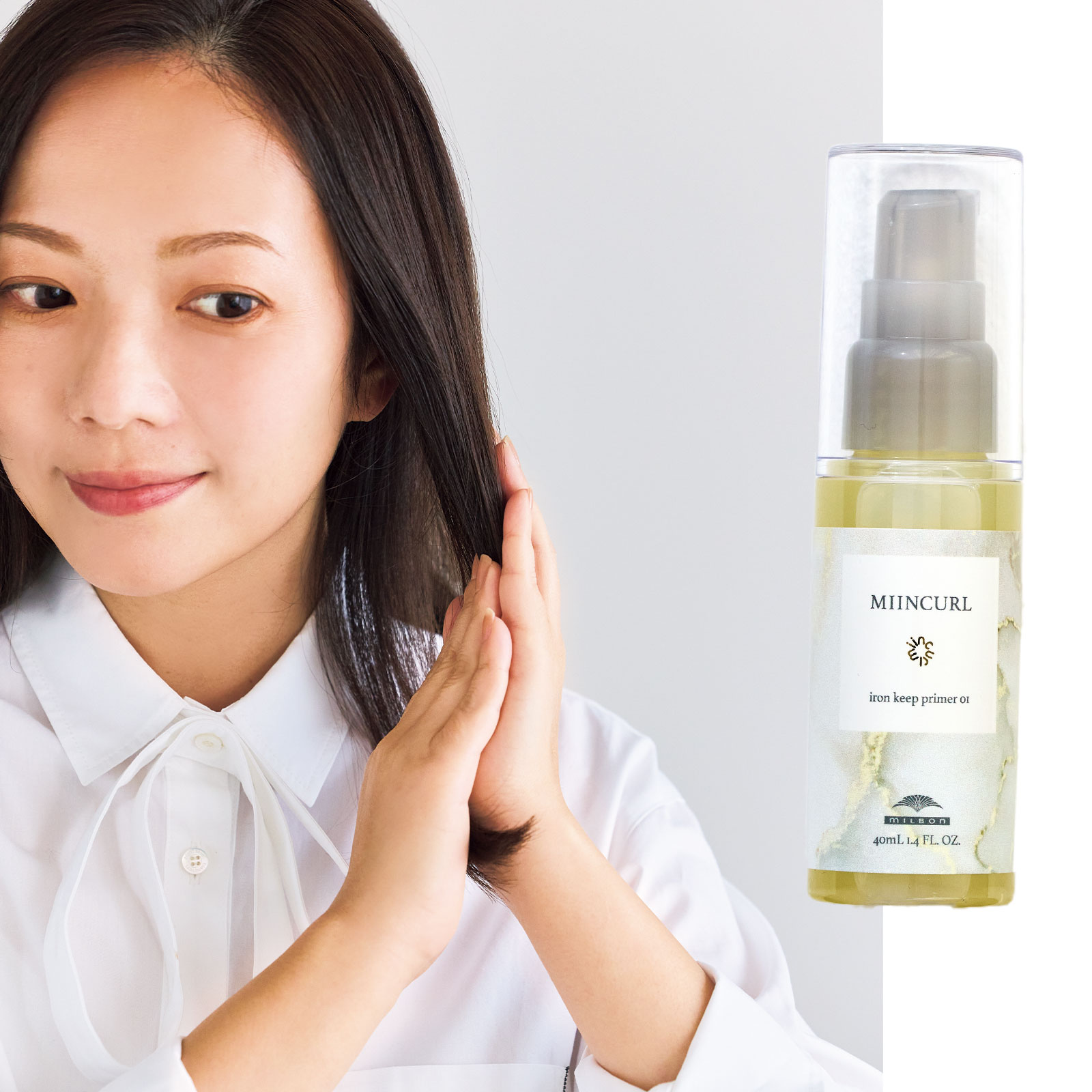写真右/アイロン前に仕込めば安心。ミインカール アイロンキーププライマー 01 40ml ¥3,080〈サロン専売品〉(ミルボン)