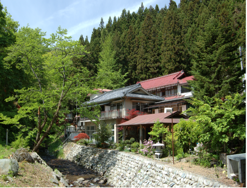 八ッ場ダムまで車で10分ほどの山あいにある静かな一軒宿で、宿泊者だけが入れる特別な温泉。旅館前を流れる雁ケ沢川の川底から湧き出しているという珍しい温泉なので川中温泉と呼ばれているそう。川中温泉は「日本三美人の湯」の一つですが、日本三美人の湯は1920年に当時の鉄道院が編纂した「温泉案内」の中で効能に「肌を白くする」と記載されていた3つの温泉で、実際に通った方々の経験値から選定されたものなので説得力がありますね。