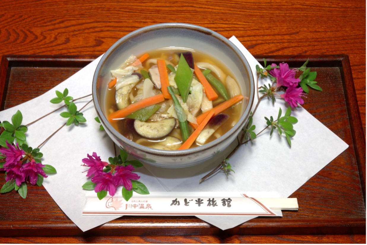 食堂でいただく夕飯は、鯉の洗いや岩魚の塩焼き、野菜蒸し焼きなどに加え、名物の「おっきりこみ」という郷土料理のうどん。「材料を切って、煮込む」→「きり、こみ」→「おきりこみ」になったという説もあり、素朴な味ながら絶品。