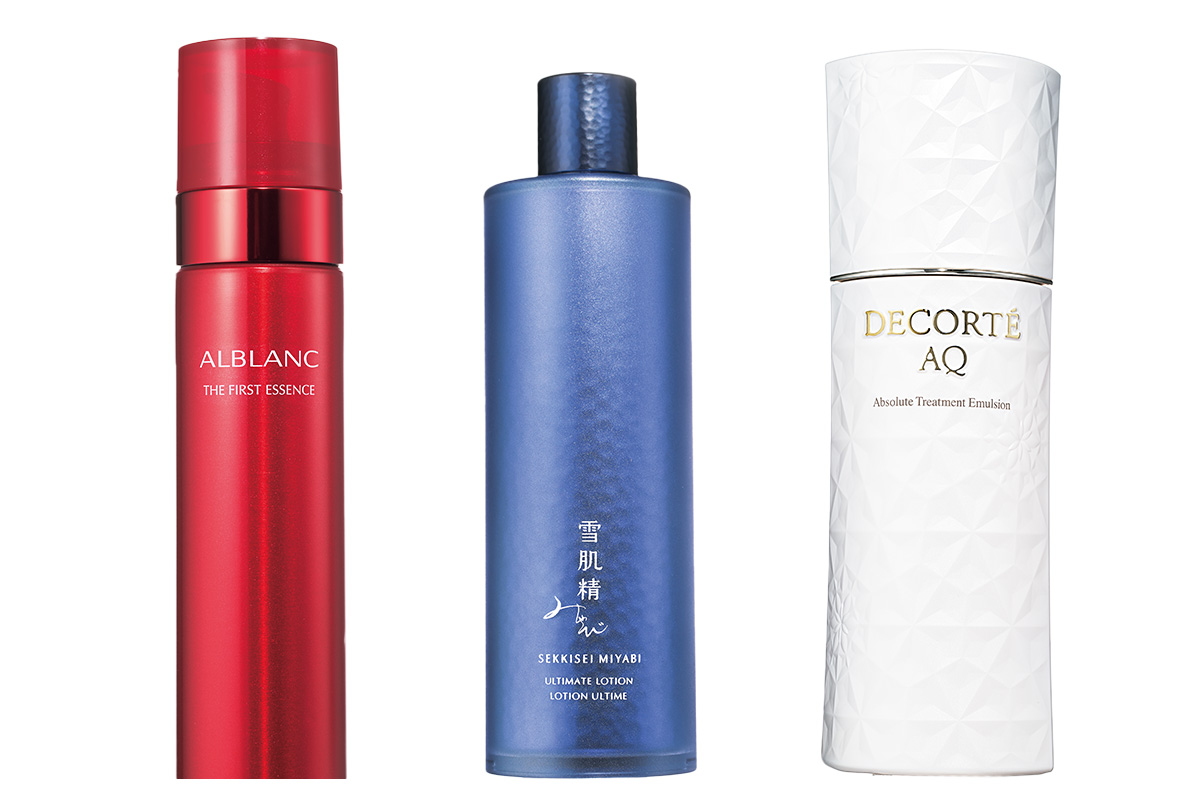 左から:アルブランザ ファーストエッセンス 90 g ¥11,000 [医薬部外品](花王)雪肌精みやびアルティメイトロ ーション 200ml¥11,0 00(編集部調べ)(コーセー) AQ アブソリュート エマルジョン マイクロ ラディアンス200ml¥11,0 00(コスメデコルテ)