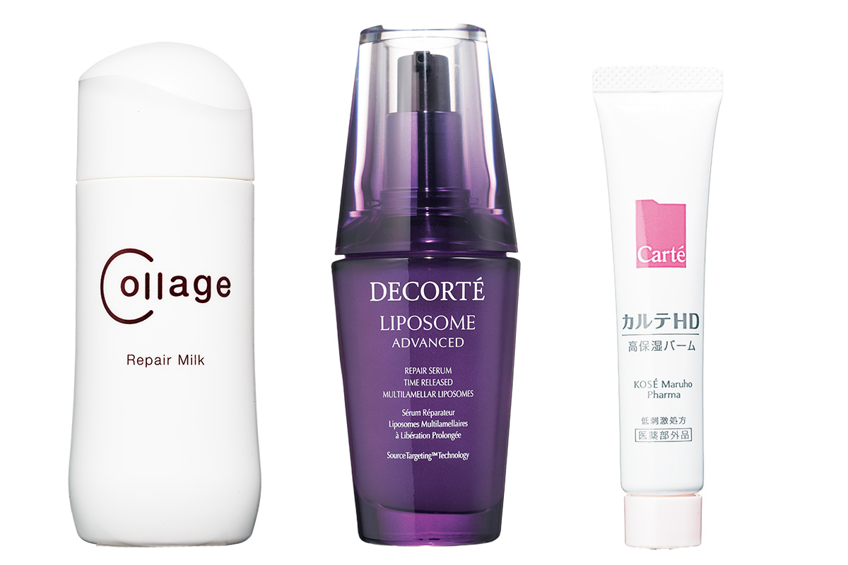 ゆらぎを感じたらすぐにスイッチ。左から:コラージュリペアミルク[医薬部外品]100ml¥ 3,300(持田ヘルスケア)リポソーム アドバンスト リペアセラム 50ml¥12,100(コスメデコルテ)カルテHD モイスチュアバーム[医薬部外品]15g ¥1,320(編集部調べ)(コーセーマルホファーマ)