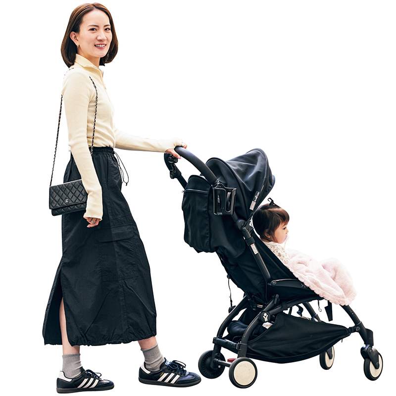 「公園でもスカートで可愛さを取り入れたい時に愛用中。ナイロン素材で軽くて動きやすいから、遊び盛りな長男と追いかけっこもできちゃう。後ろスリット入りで屈みやすく、ベビーとのお出かけも難なくクリア!」