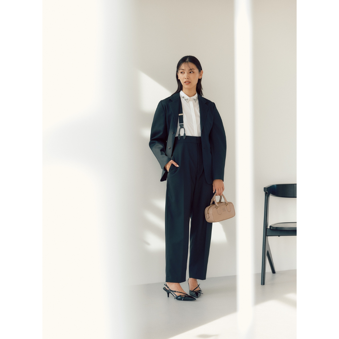 サスペンダーパンツとジャケットはロエフ、ブラウスはユナイテッドアローズ、バッグとパンプスはミュウミュウ。