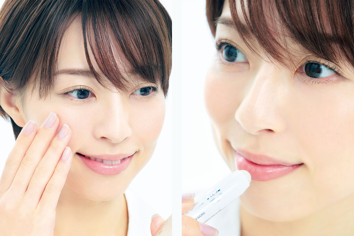 左/「ツヤを出したい高いところにプライマーをのせて外に伸ばすだけできれいなメリハリが出ます」右/「舞台では落ちにくいティントリップをつけるので唇が荒れがち。夜はスクラブリップを塗って寝ます」