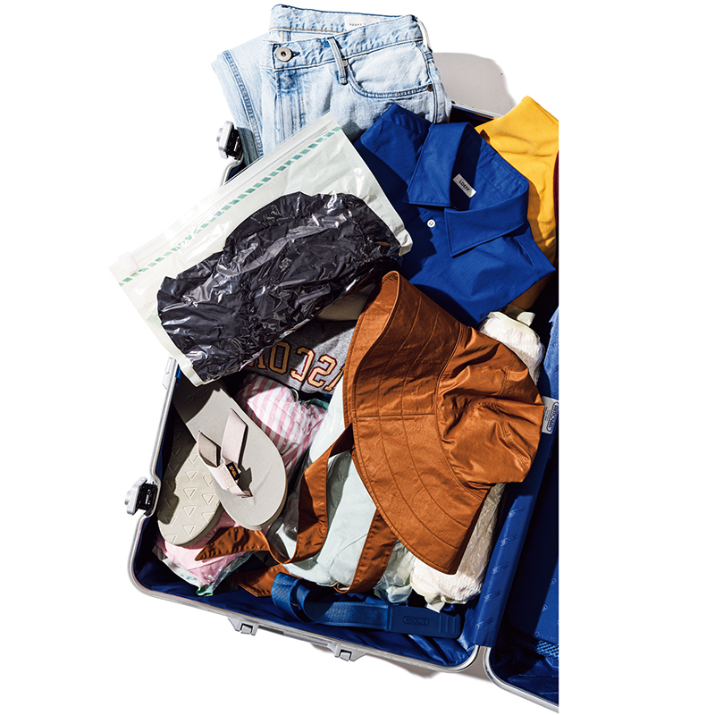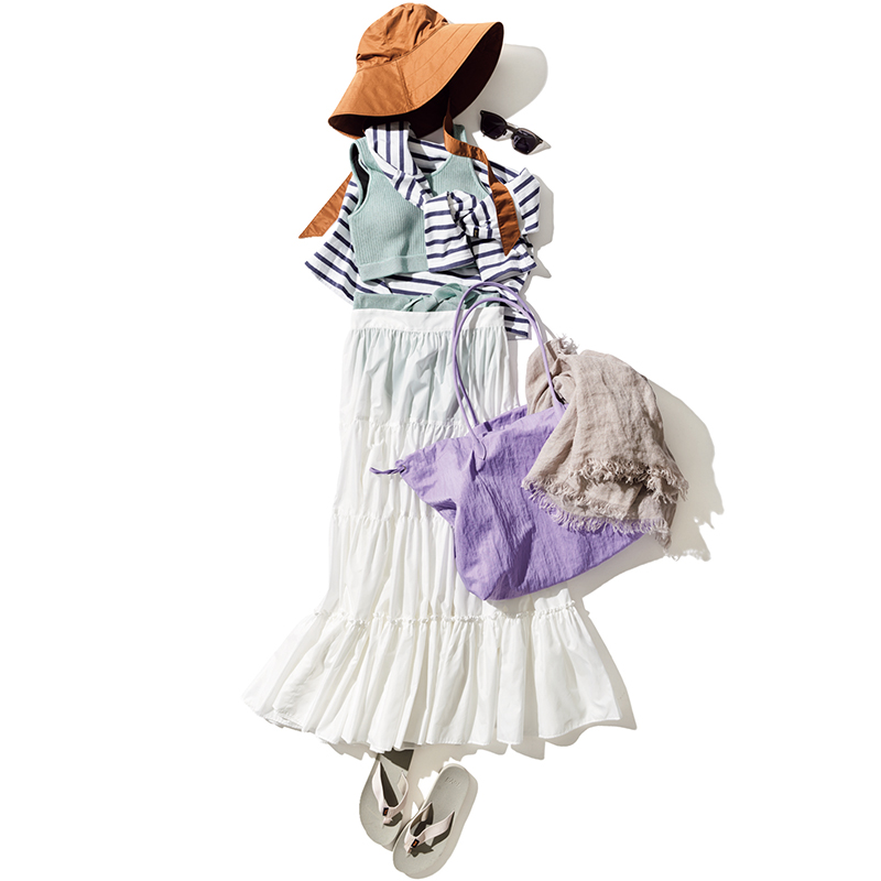スカート[共布サスペンダー付き]¥30,000(シーニュ)スイムウェア¥20,900〈プロタゴニスタ フォー ユナイテッドアローズ〉ハット¥17,600〈キジマ タカユキ フォー ユナイテッドアローズ〉ストール¥29,700〈アソース メレ〉(すべてユナイテッドアローズ 渋谷スクランブルスクエア店)たすき掛けしたカットソー¥13,200(ルミノア/ゲストリスト)バッグ¥27,500(メアリ オル ターナ/ユナイテッドアローズ 丸の内店)サンダル¥6,380(テバ/デッカーズジャパン)