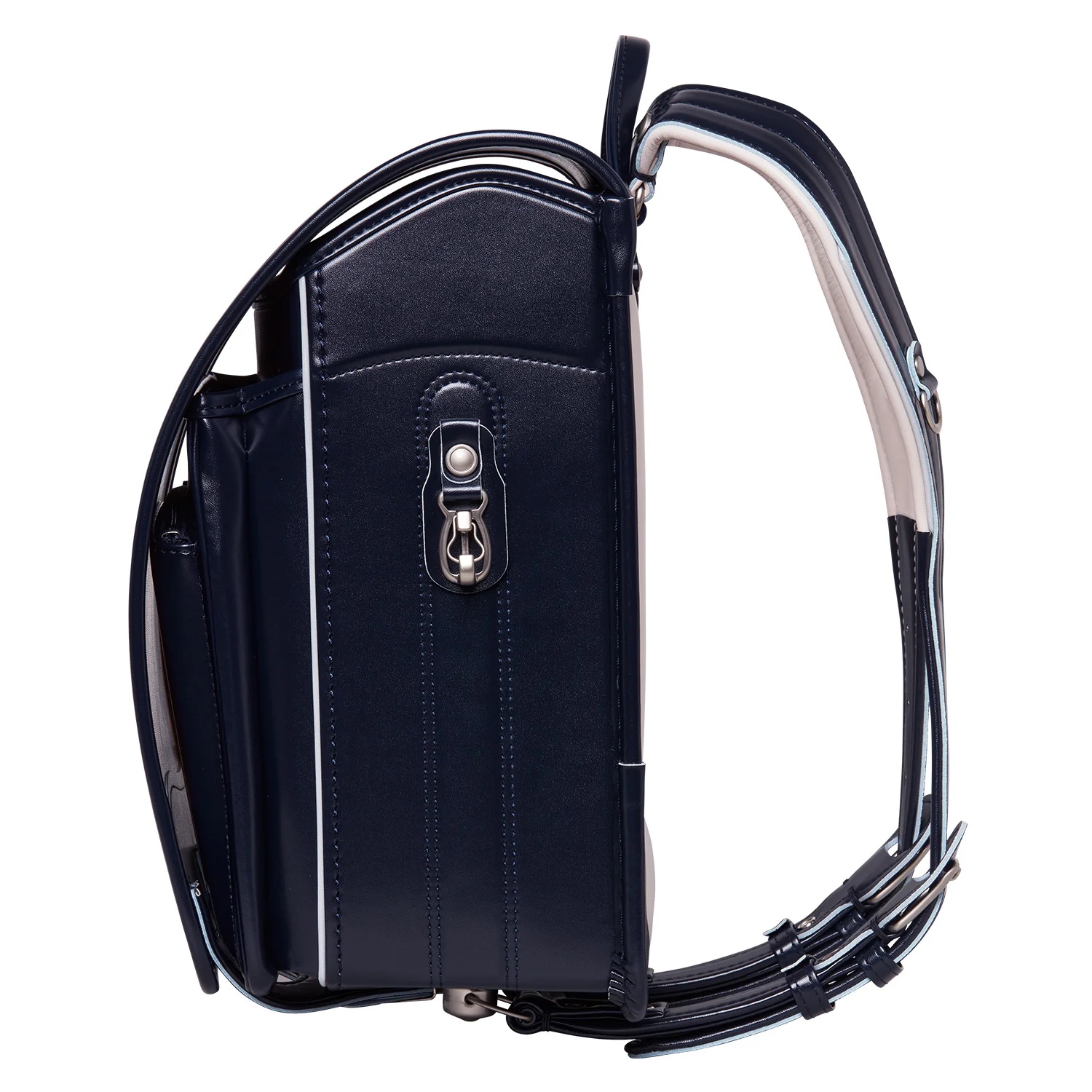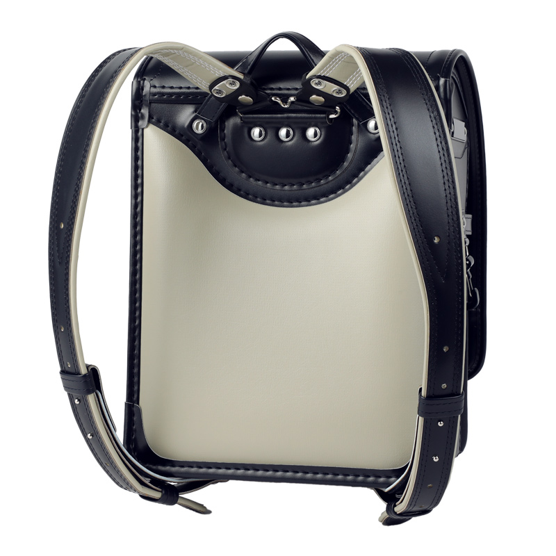 防水牛革を使った半カブセタイプ。個性的かつクラシカルな雰囲気です。色展開も濃いめのコン、グリーンやアンティークワインと深く味わいのある色合いが特徴的。高学年になっても飽きないシンプルなデザインで、グレージュ色の背あては白に比べて汚れが目立ちにくいことも嬉しいポイントです。防水牛革ルーチェ 半カブセ ランドセル[色:紺、主素材:牛革、重量:約1,250g]¥77,000(池田屋)