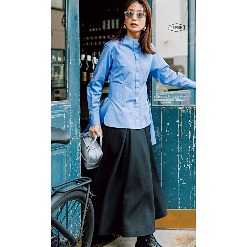 ブラウス¥37,400(レリタージュ マルティニーク/マルティニーク ルミネ横浜)スカート¥59,400(シーエスジー/カレンソロジー新宿)サングラス¥50,600(モスコット/モスコット トウキョウ)ピアス¥28,600(マユ/マユ ショールーム)バッグ¥198,000(J&M デヴィッドソン)ブーツ¥41,800(ファビオ ルスコーニ/ファビオ ルスコーニ ジェイアール名古屋タカシマヤ店)