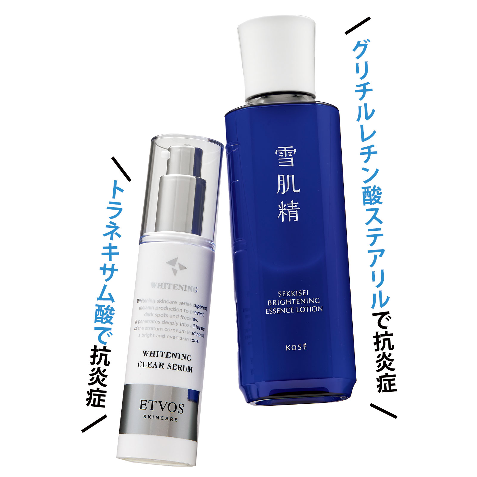 左・薬用 ホワイトニングクリアセラムW[医薬部外品] 50ml ¥5,940(エトヴォス)右・薬用雪肌精 ブライトニング エッセンス ローション[医薬部外品]200ml ¥3,850 〈編集部調べ〉(コーセー)