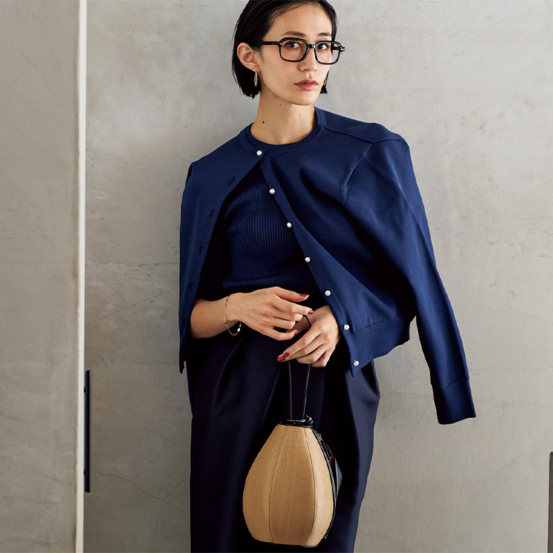 カーディガン¥6,589ニット¥5,489(ともにロネルバイコーエン/コーエン)スカート¥29,700(マルティニーク/マルティニーク ルミネ横浜)メガネ¥49,500(アイヴァン/アイヴァン 東京ギャラリー)ピアス¥66,000ブレスレット¥60,500(ともにウノアエレ/ウノアエレ ジャパン)バッグ¥36,300(VASIC/ヴァジックジャパン)