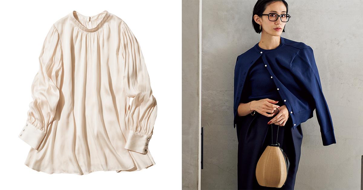 とろみのある光沢生地で、オフィスでも好印象。送迎~通勤とバタつく朝に頼りになる。
