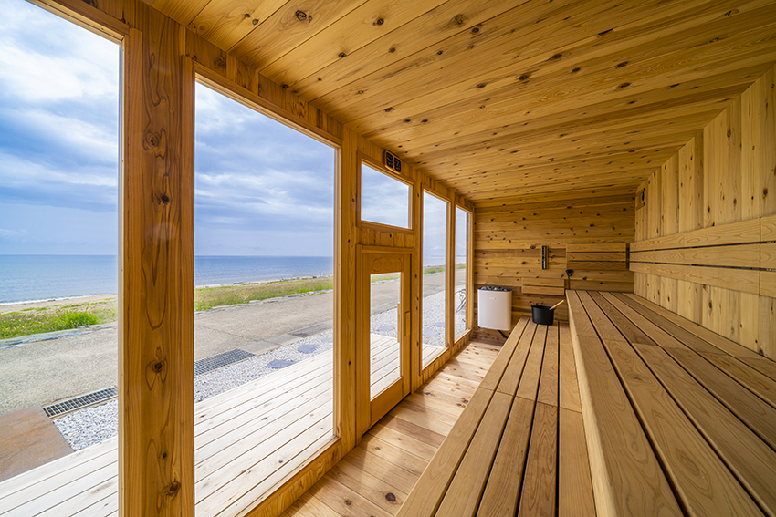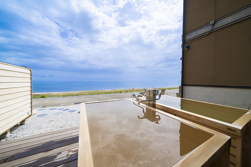 昨年新設された貸切利用ができるプライベートサウナは要水着着用のオーシャンビュー。サウナ横にある温泉を冷ました温泉水風呂と地下水の水風呂のほか、徒歩10歩の海を水風呂代わりにしてもOK!