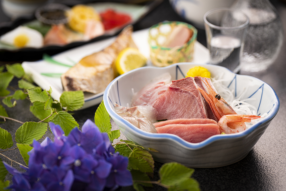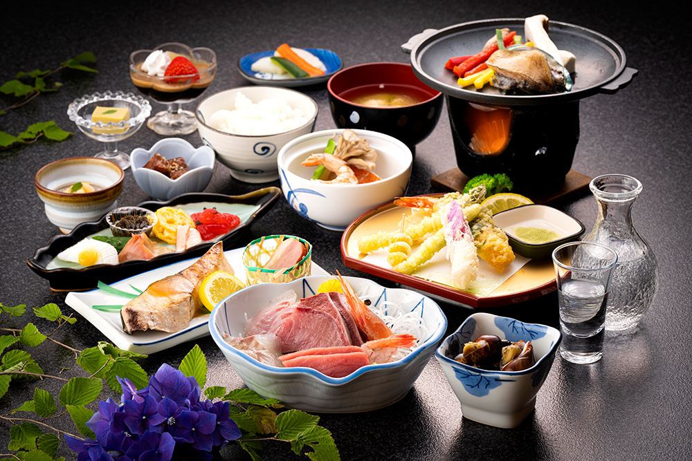 氷見漁港で水揚げされた新鮮なお刺身をはじめ、アワビやきときとなど富山の旬の食材を使った海鮮料理コースが絶品。冬期はオプションで鰤しゃぶに変更も可能です。